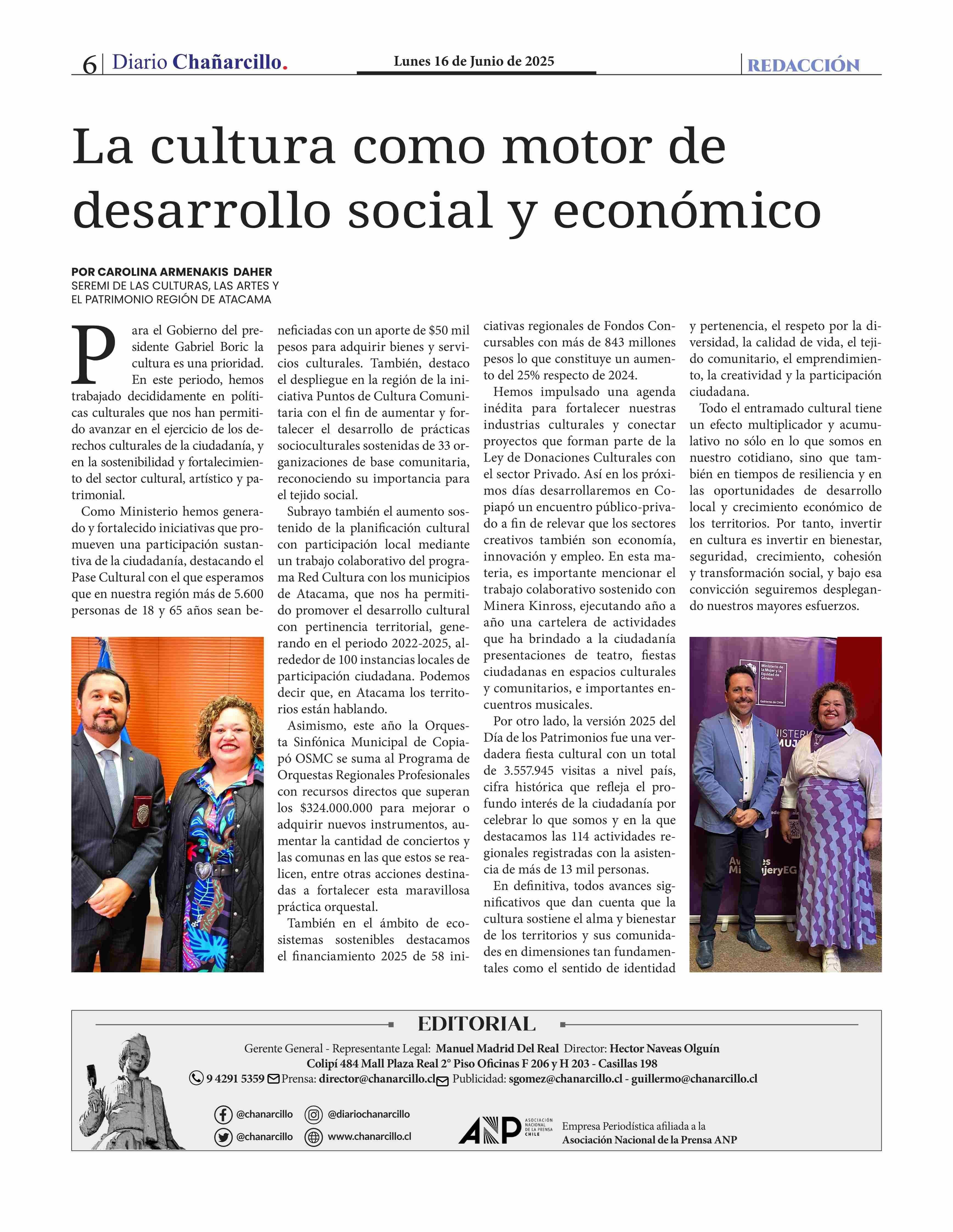 La cultura como motor de desarrollo social y económico 16-06-2025 Diario Chañarcillo |