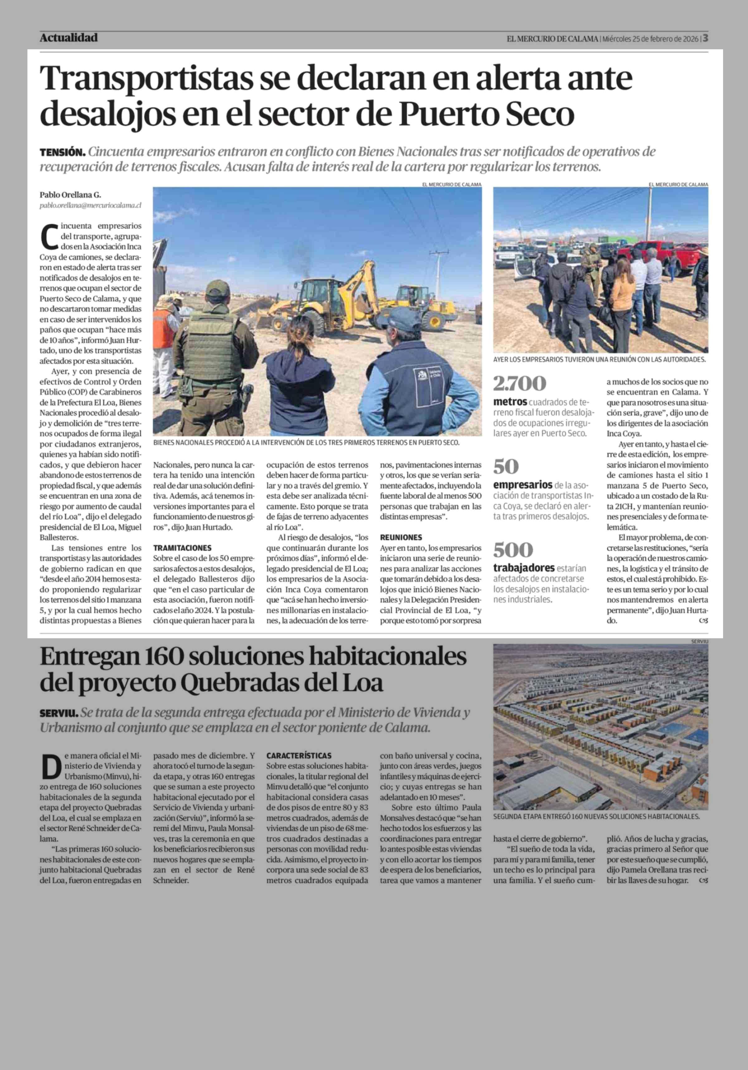 Transportistas se declaran en alerta ante desalojos en el sector de Puerto Seco 25-02-2026 El Mercurio de Calama |