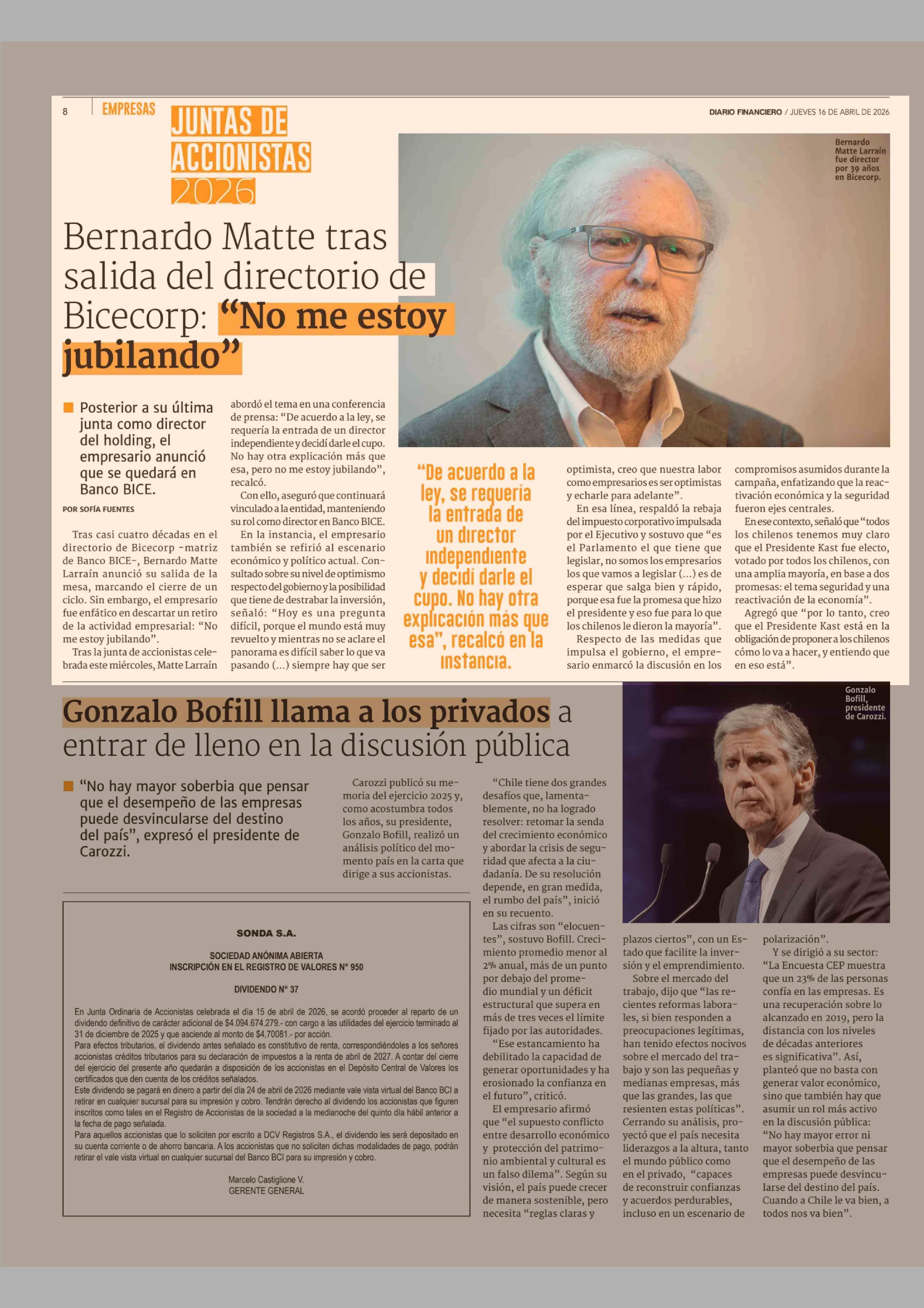 Bernardo Matte tras salida del directorio de Bicecorp: "No me estoy jubilando" 16-04-2026 Diario Financiero |
