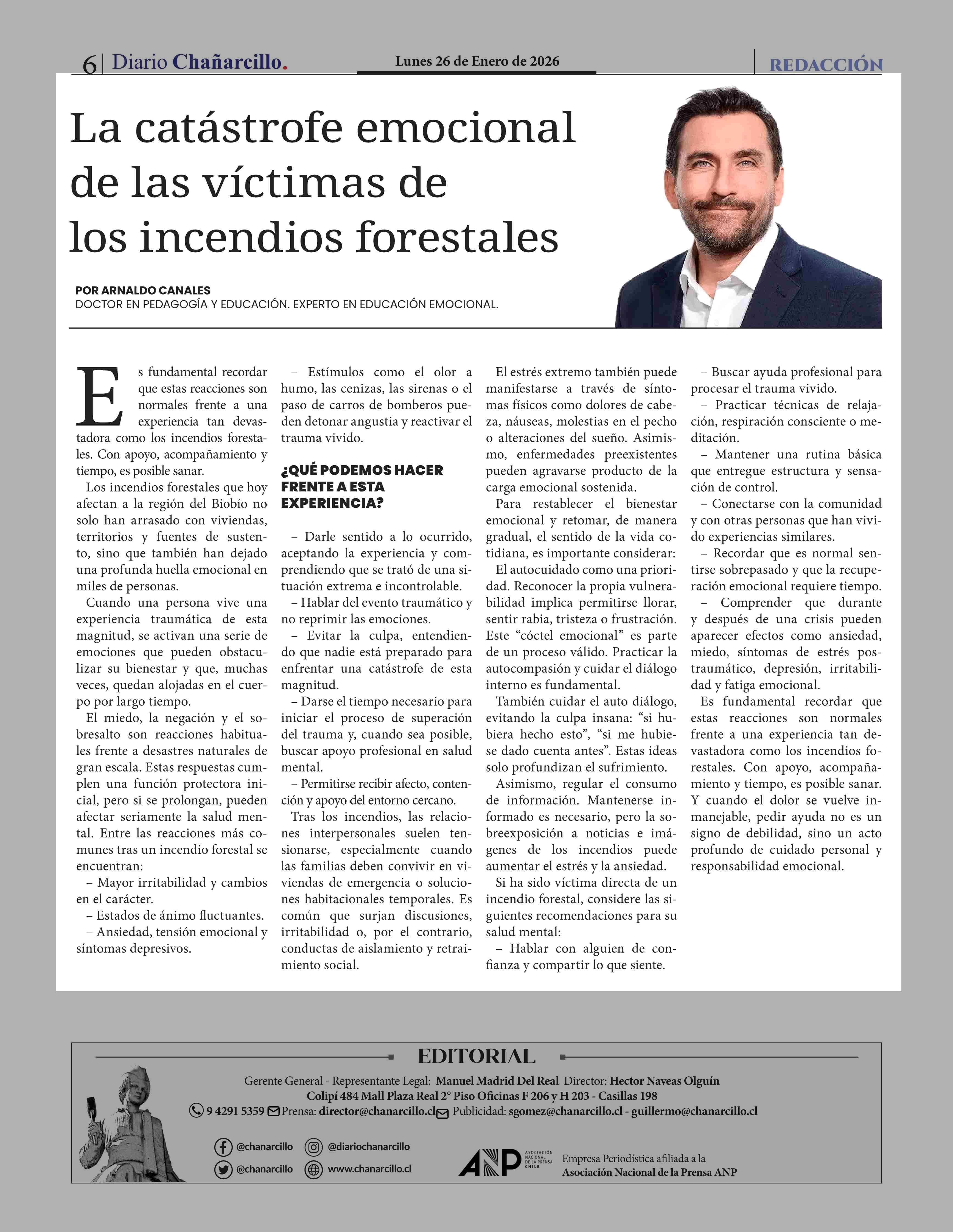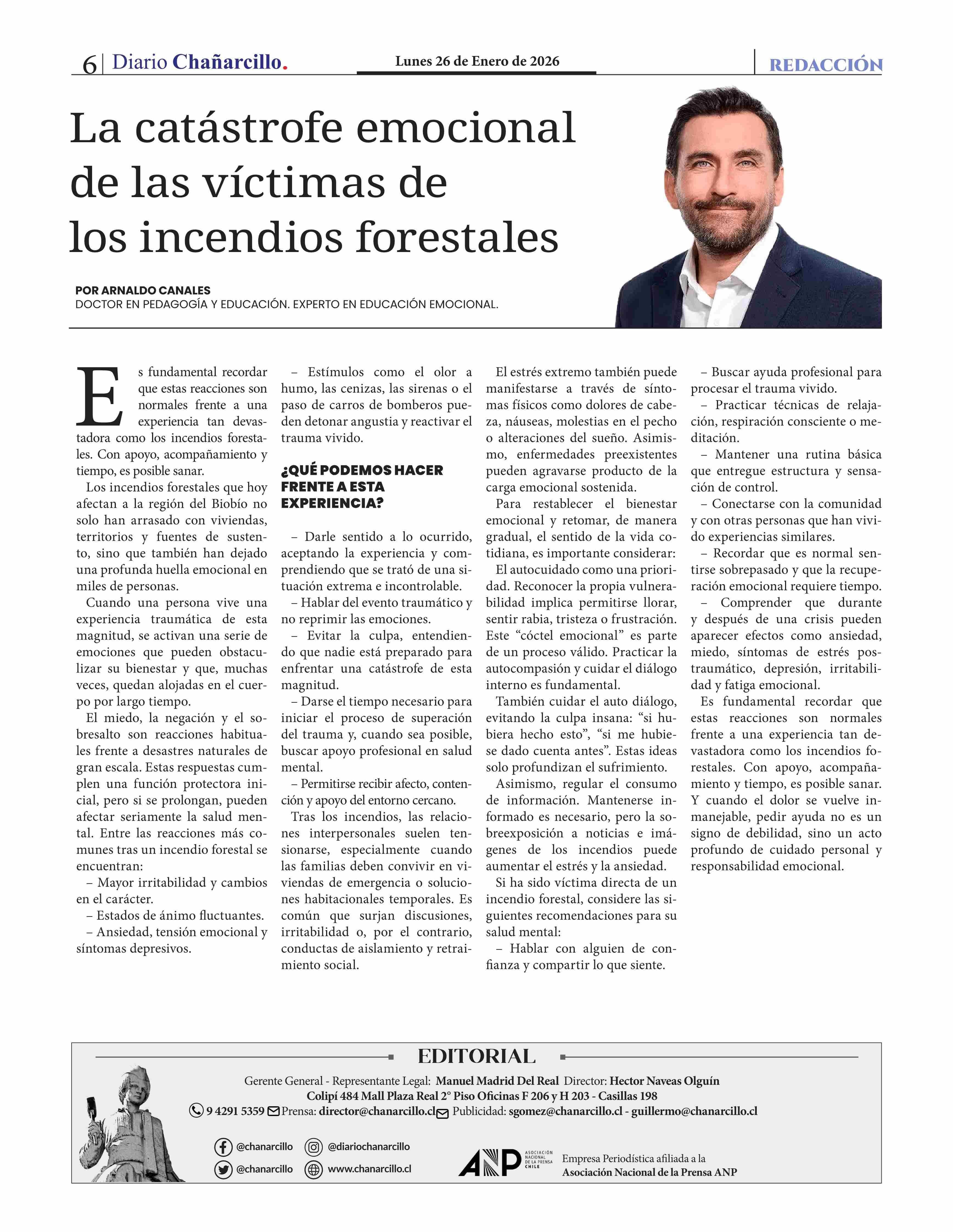 Columnas de Opinión: La catástrofe emocional de las víctimas de los incendios forestales 26-01-2026 Diario Chañarcillo |