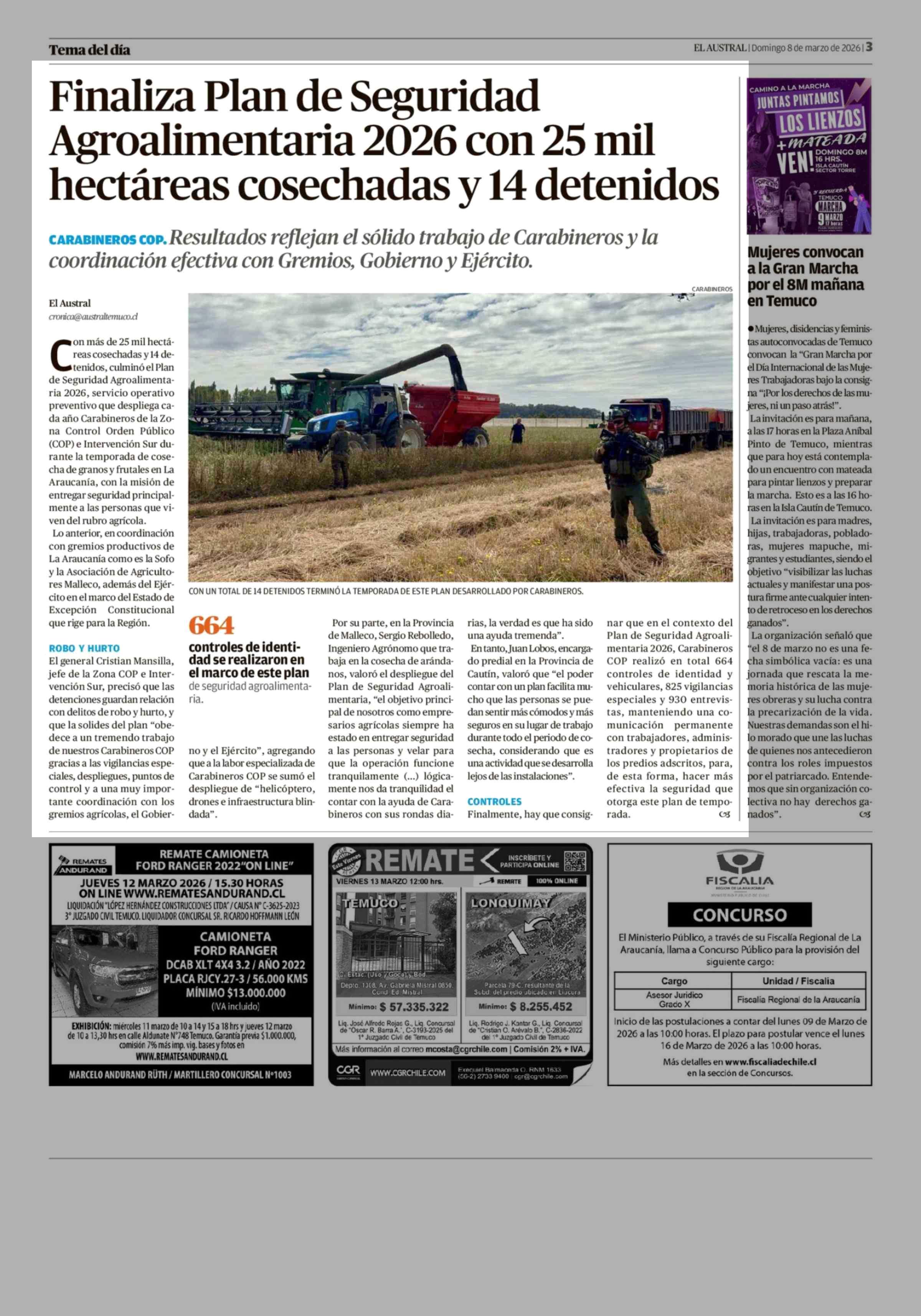 Finaliza Plan de Seguridad Agroalimentaria 2026 con 25 mil hectáreas cosechadas y 14 detenidos 08-03-2026 El Austral de la Araucanía |