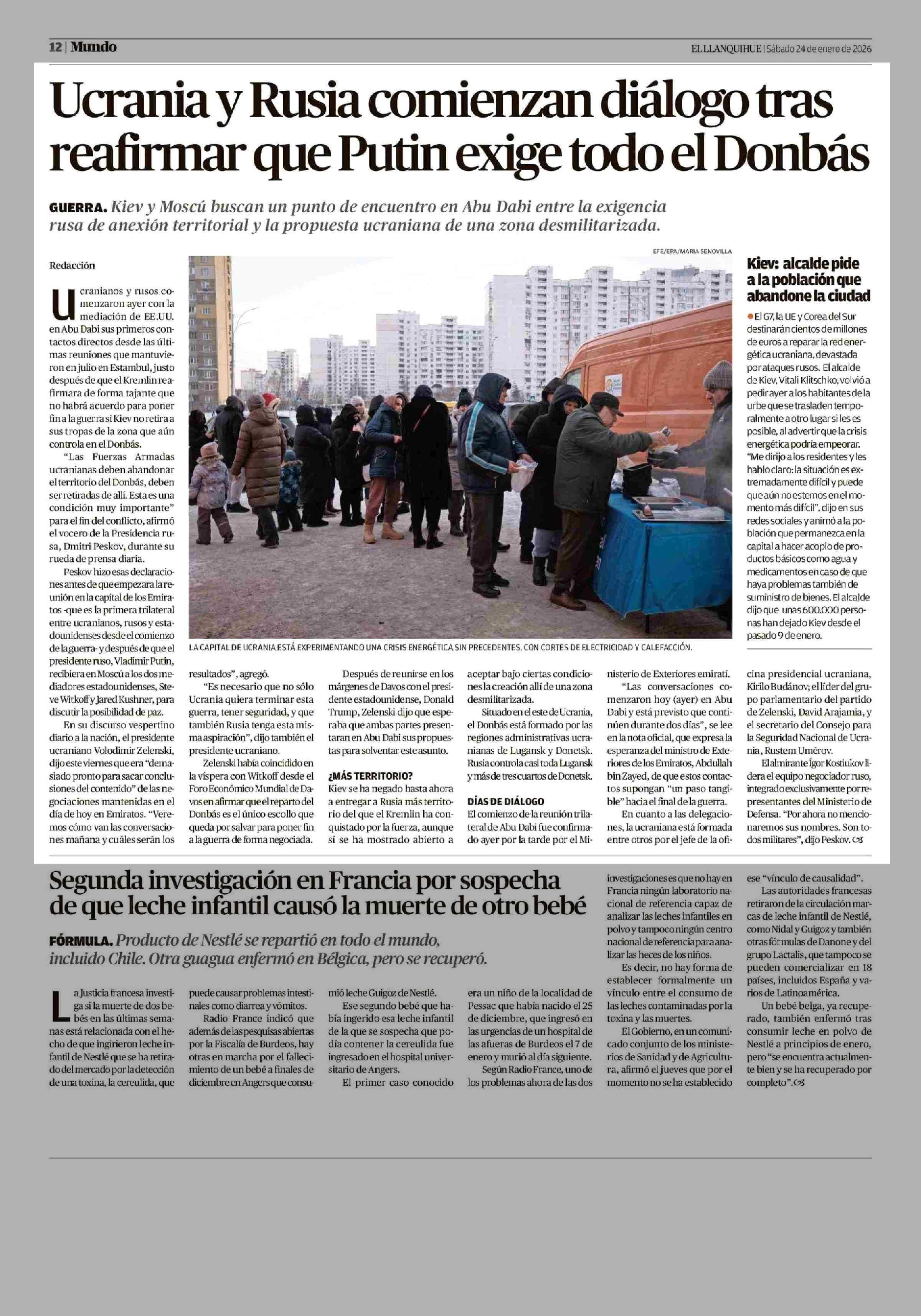 Ucrania y Rusia comienzan diálogo tras reafirmar que Putin exige todo el Donbás 24-01-2026 El Llanquihue |
