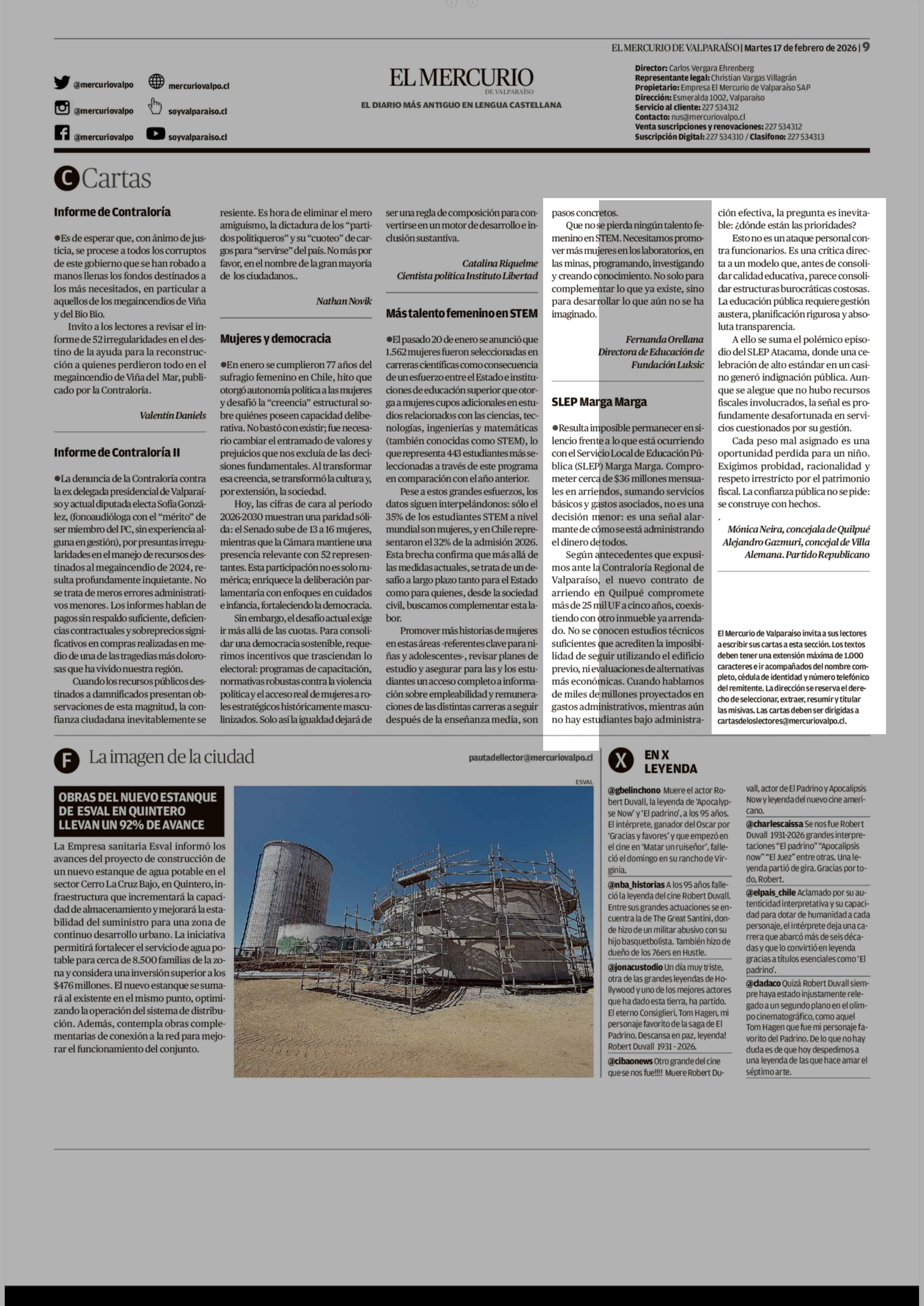 CARTAS: SLEP Marga Marga 17-02-2026 El Mercurio de Valparaíso |
