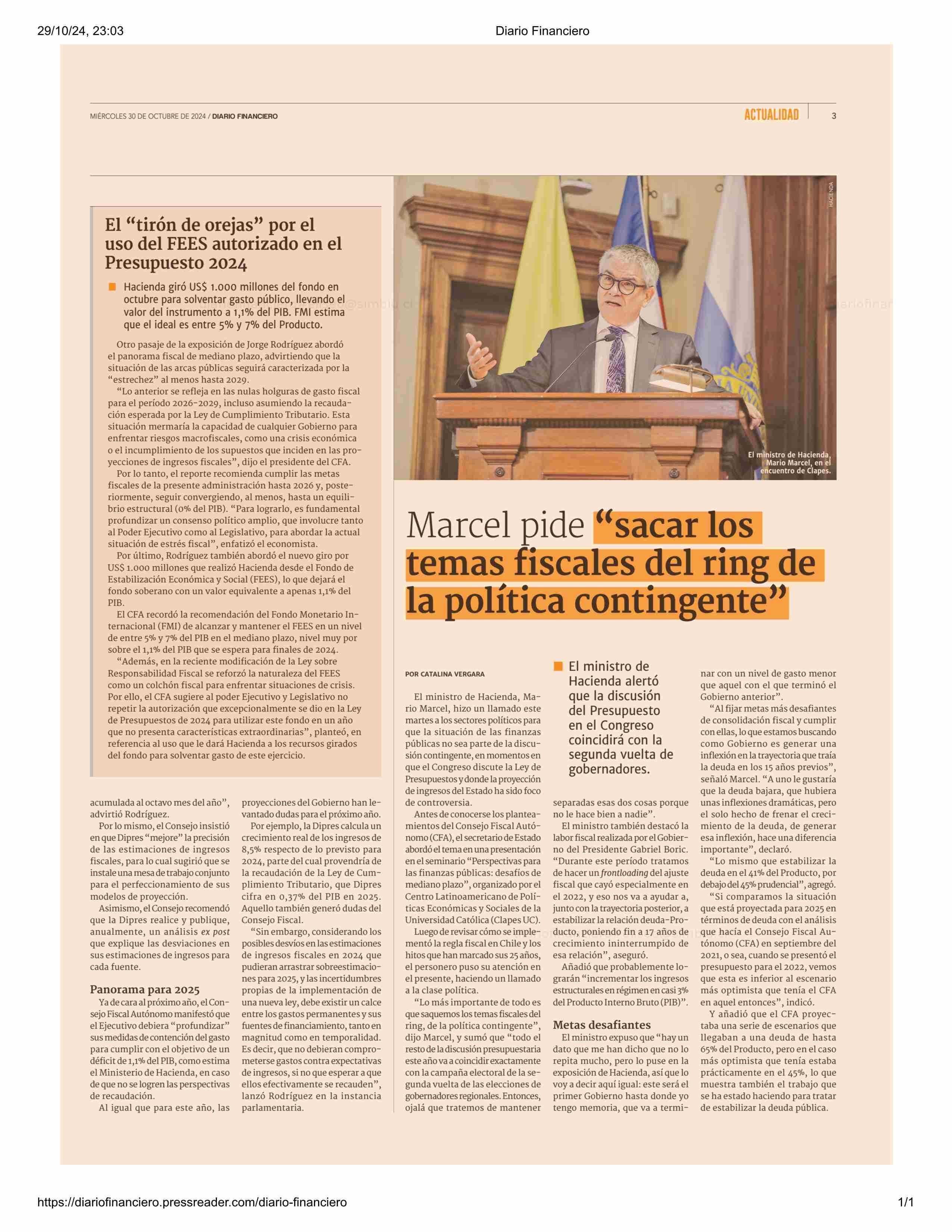 Marcel pide “sacar los temas fiscales del ring de la política contingente” 30-10-2024 Diario Financiero |