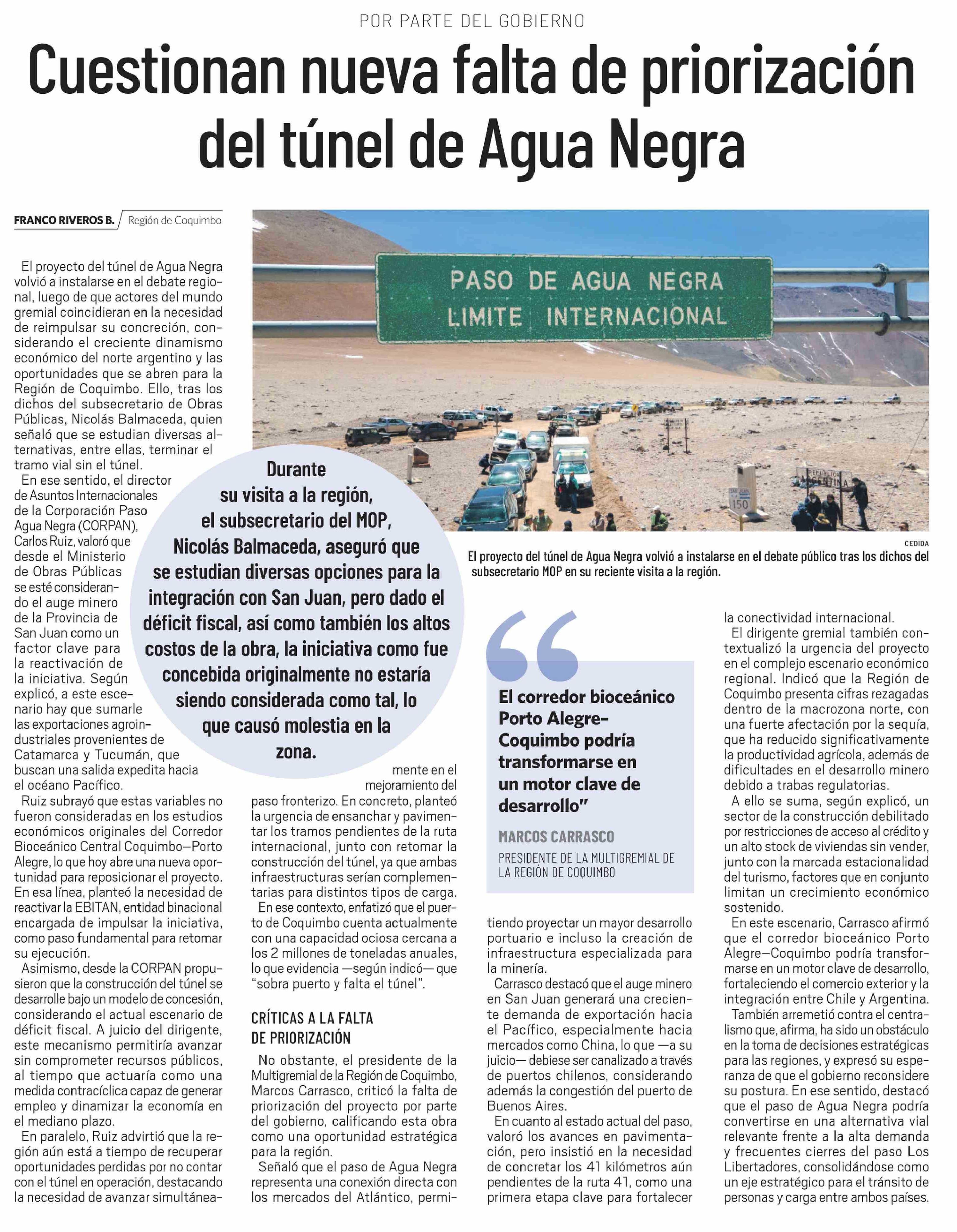 Cuestionan nueva falta de priorización del túnel de Agua Negra 31-03-2026 El Día |