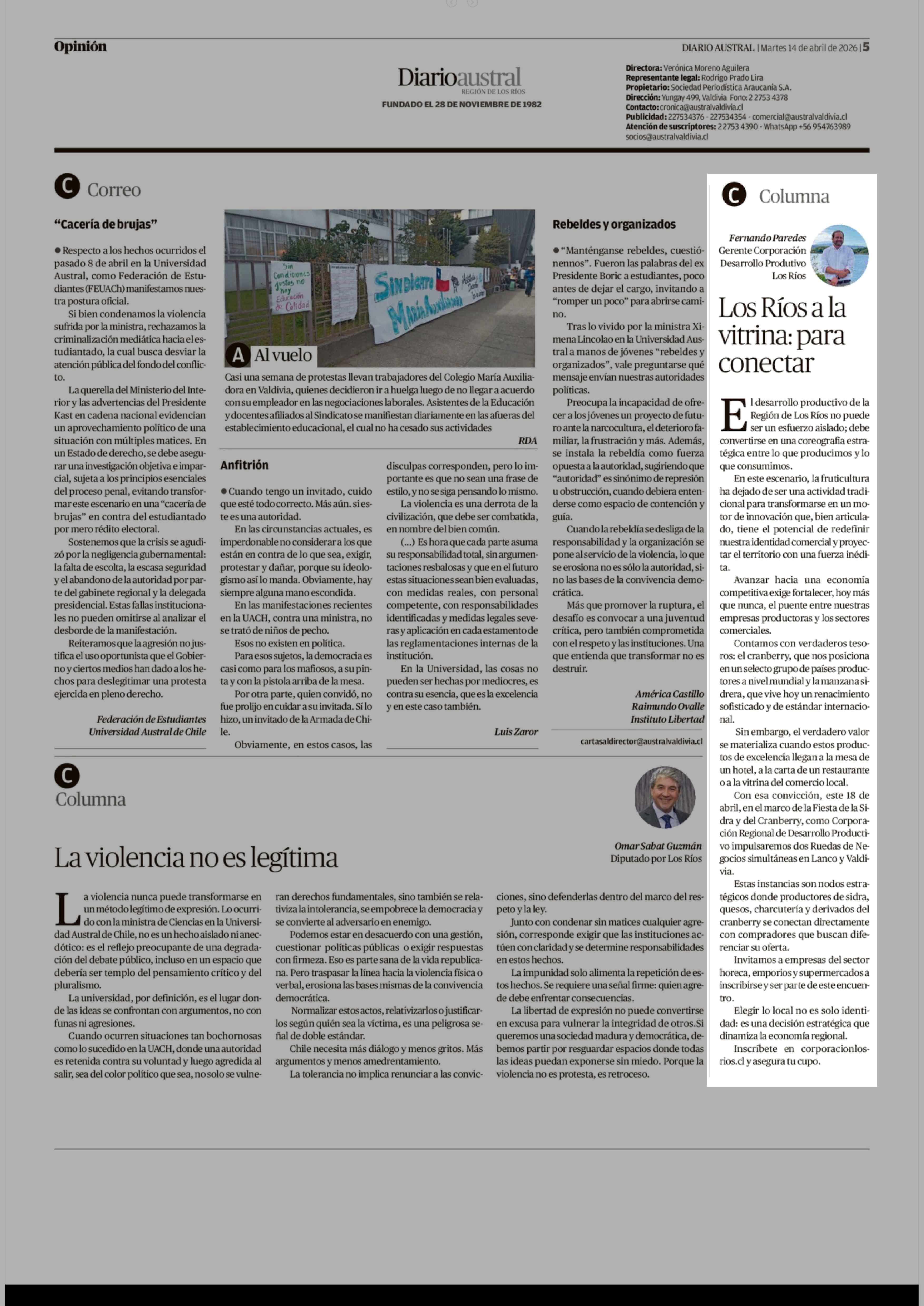 Columnas de Opinión: Los Ríos a la vitrina: para conectar 14-04-2026 Diario Austral Región de Los Ríos |