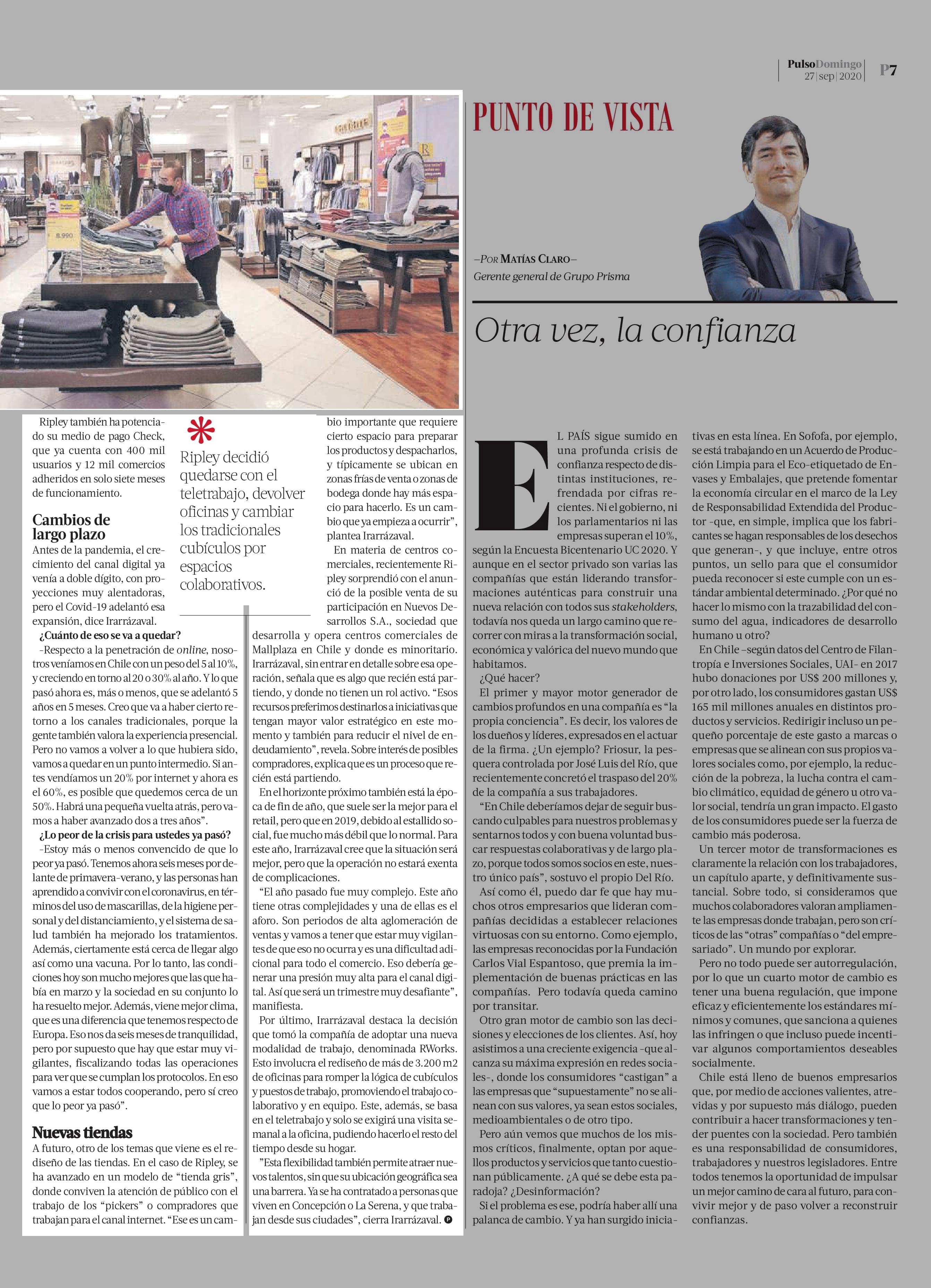 RIPLEY Delinea su plan pospandemia y proyecta que lo peor ya pasó 27-09-2020 La Tercera |