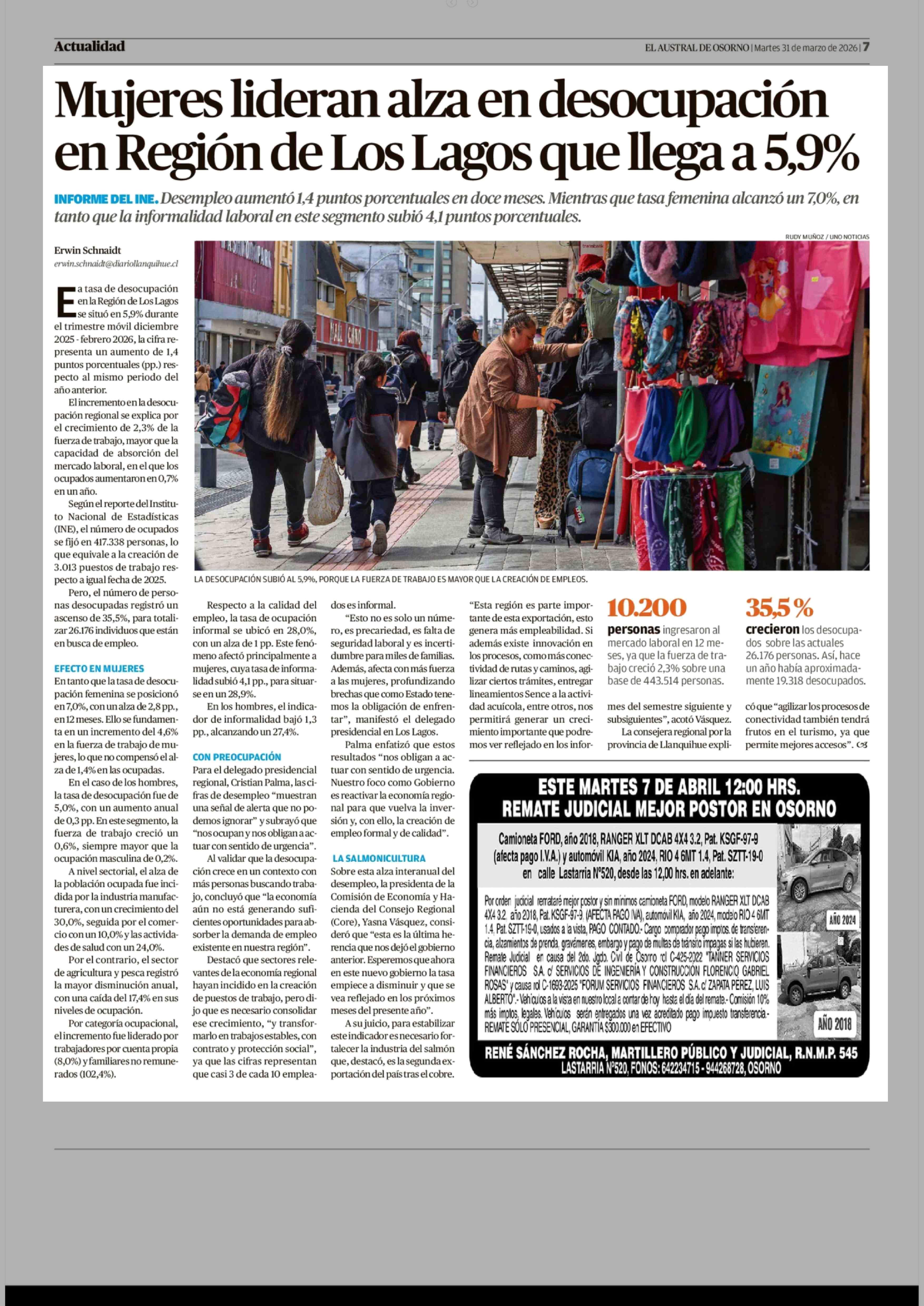 Mujeres lideran alza en desocupación en Región de Los Lagos que llega a 5,9% 31-03-2026 El Austral de Osorno |