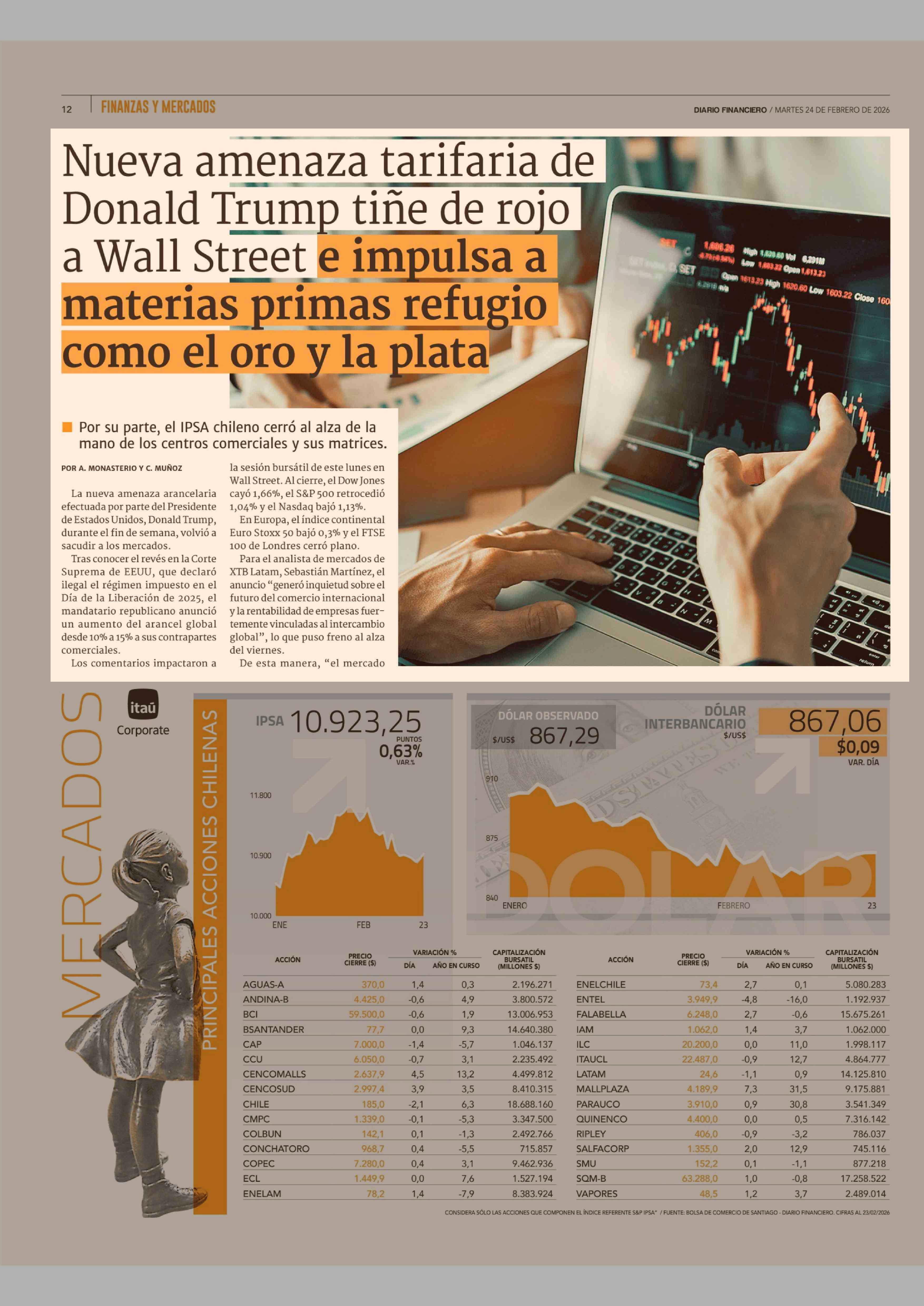 Nueva amenaza tarifaria de Donald Trump tiñe de rojo a Wall Street e impulsa a materias primas refugio como el oro y la plata 24-02-2026 Diario Financiero |