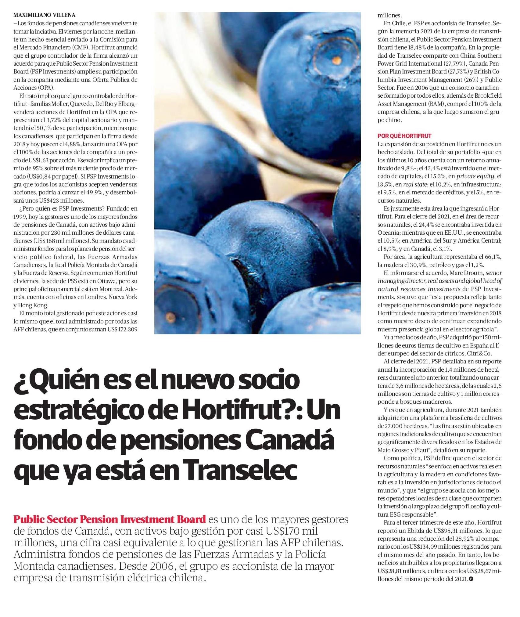 ¿Quién es el nuevo socio estratégico de Hortifrut?: Un fondo de pensiones Canadá que ya está en Transelec 20-12-2022 La Tercera |