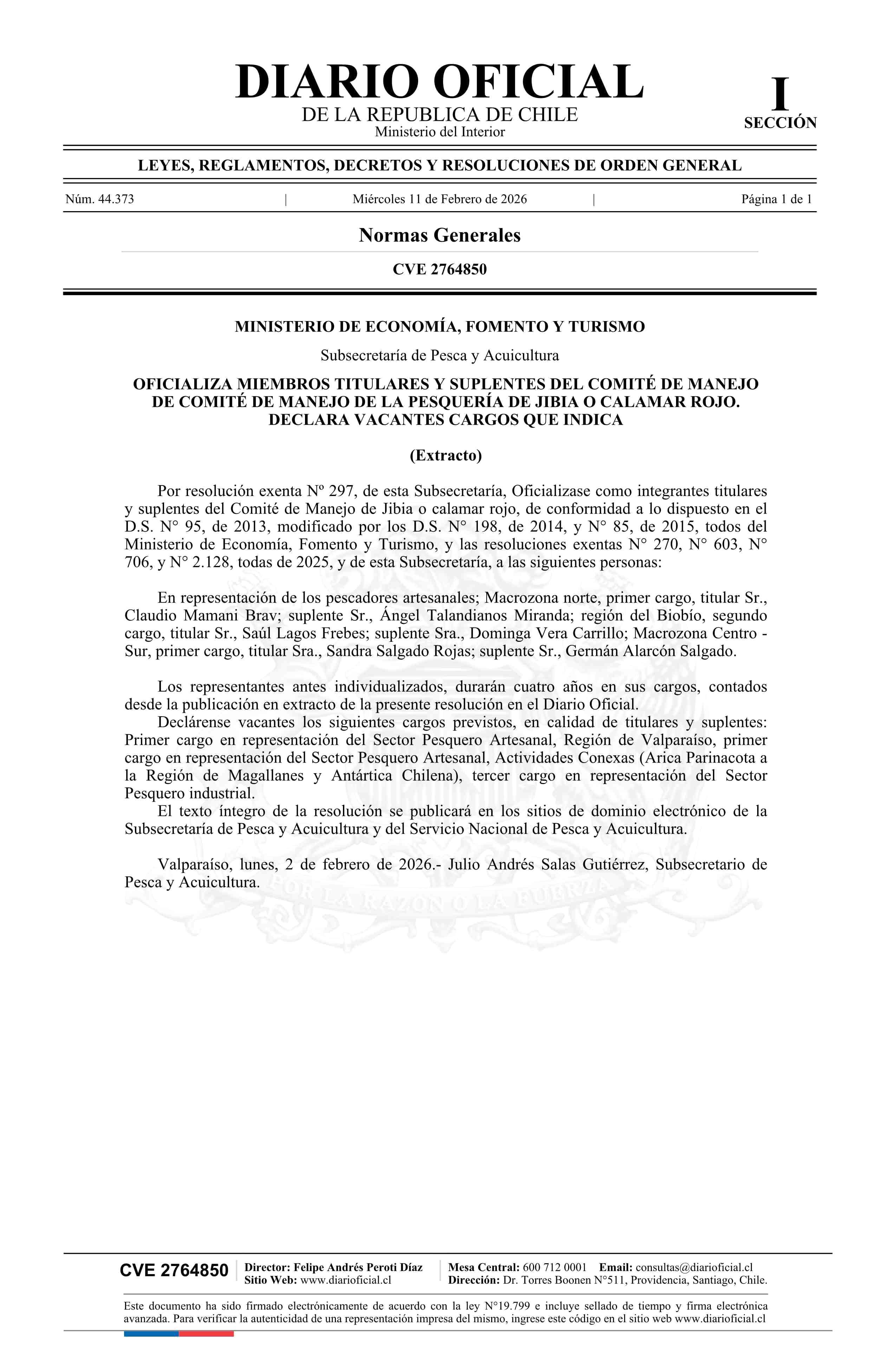 Título: Extracto de resolución exenta número 297, de 2026.- Oficializa miembros titulares y suplentes del Comité de Manejo de la pesquería de Jibia o Calamar rojo. Declara vacantes cargos que indica
