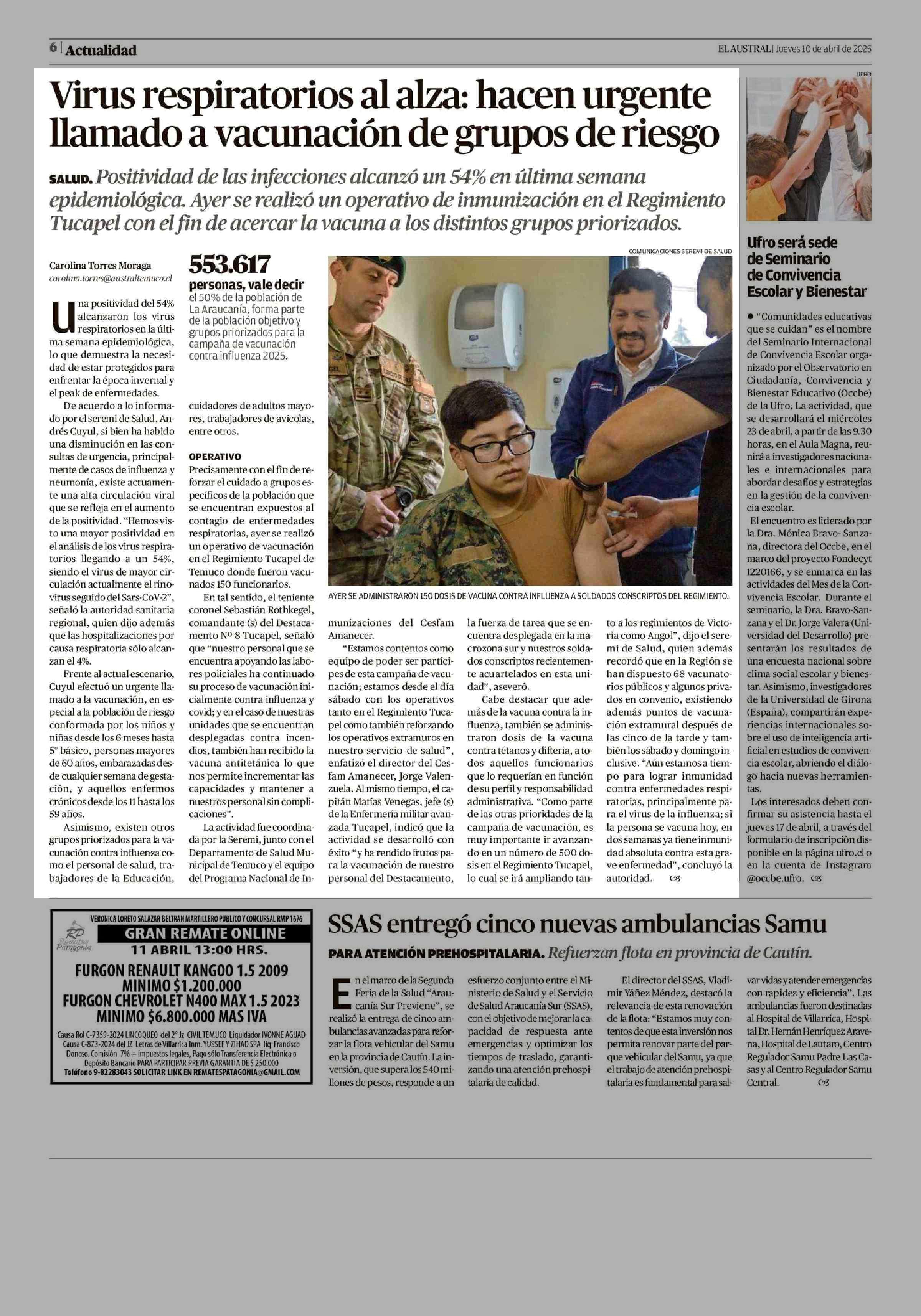 Virus respiratorios al alza: hacen urgente llamado a vacunación de grupos de riesgo 10-04-2025 El Austral de la Araucanía |