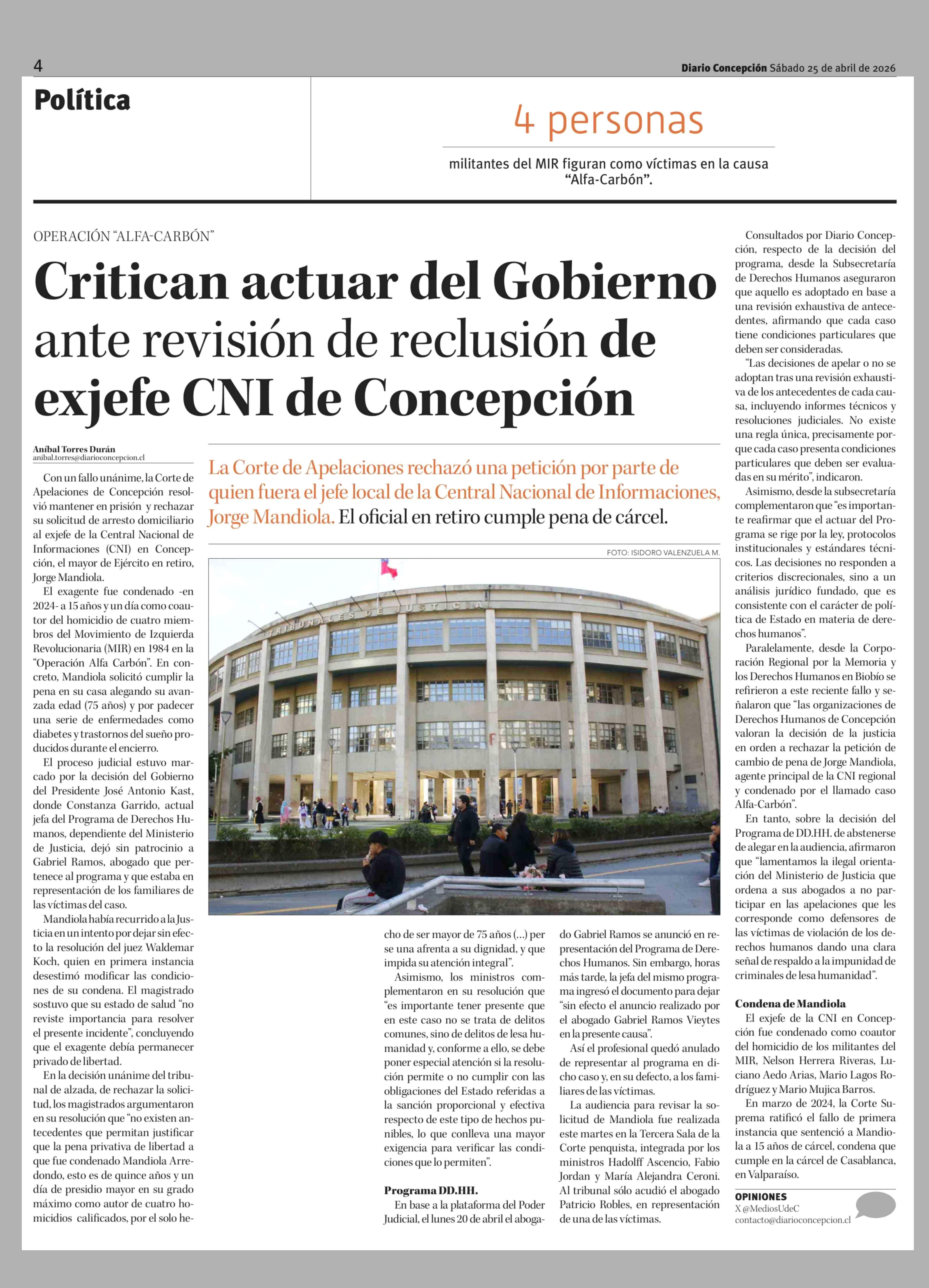 Título: Critican actuar del Gobierno ante revisión de reclusión de exjefe CNI de Concepción