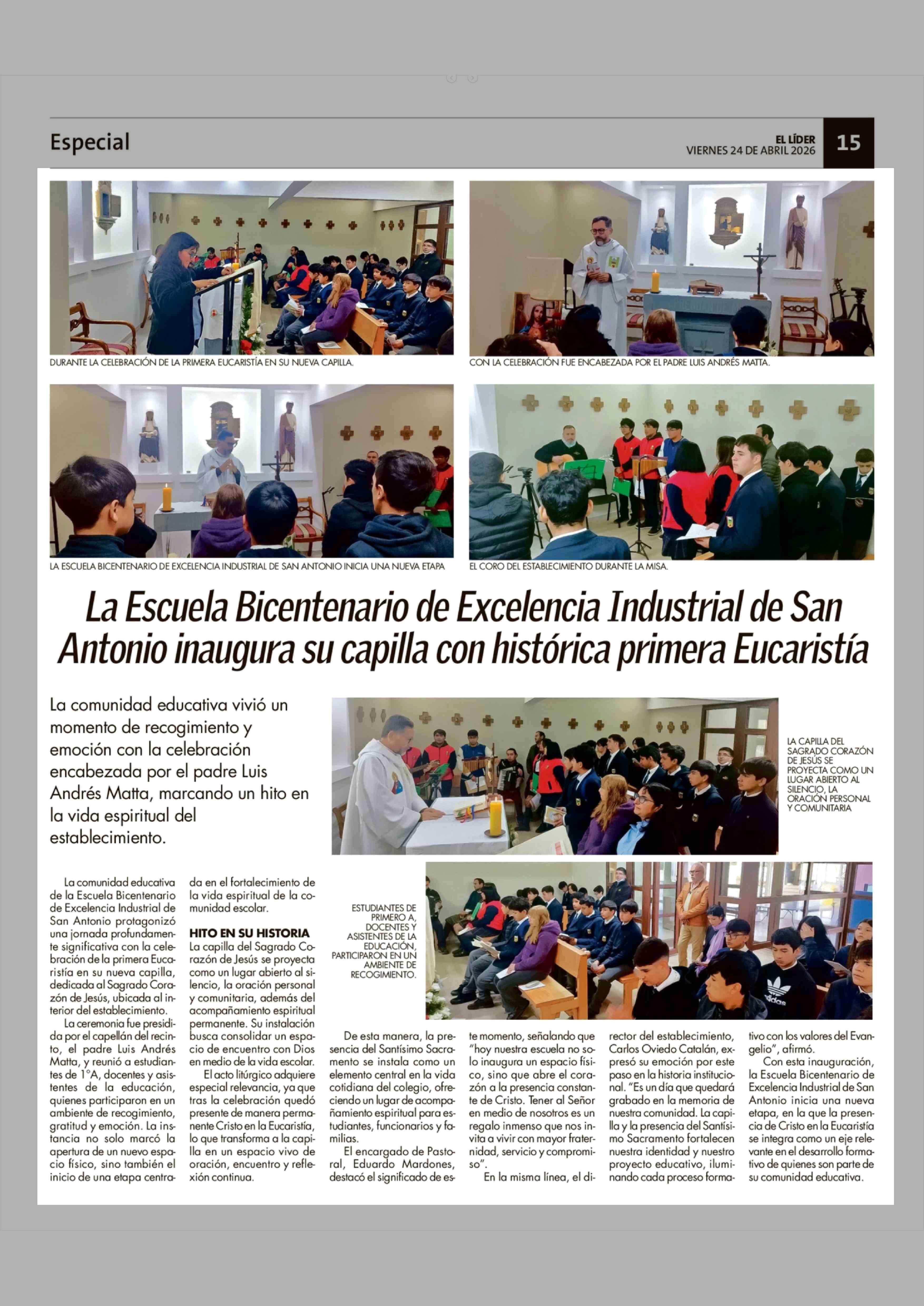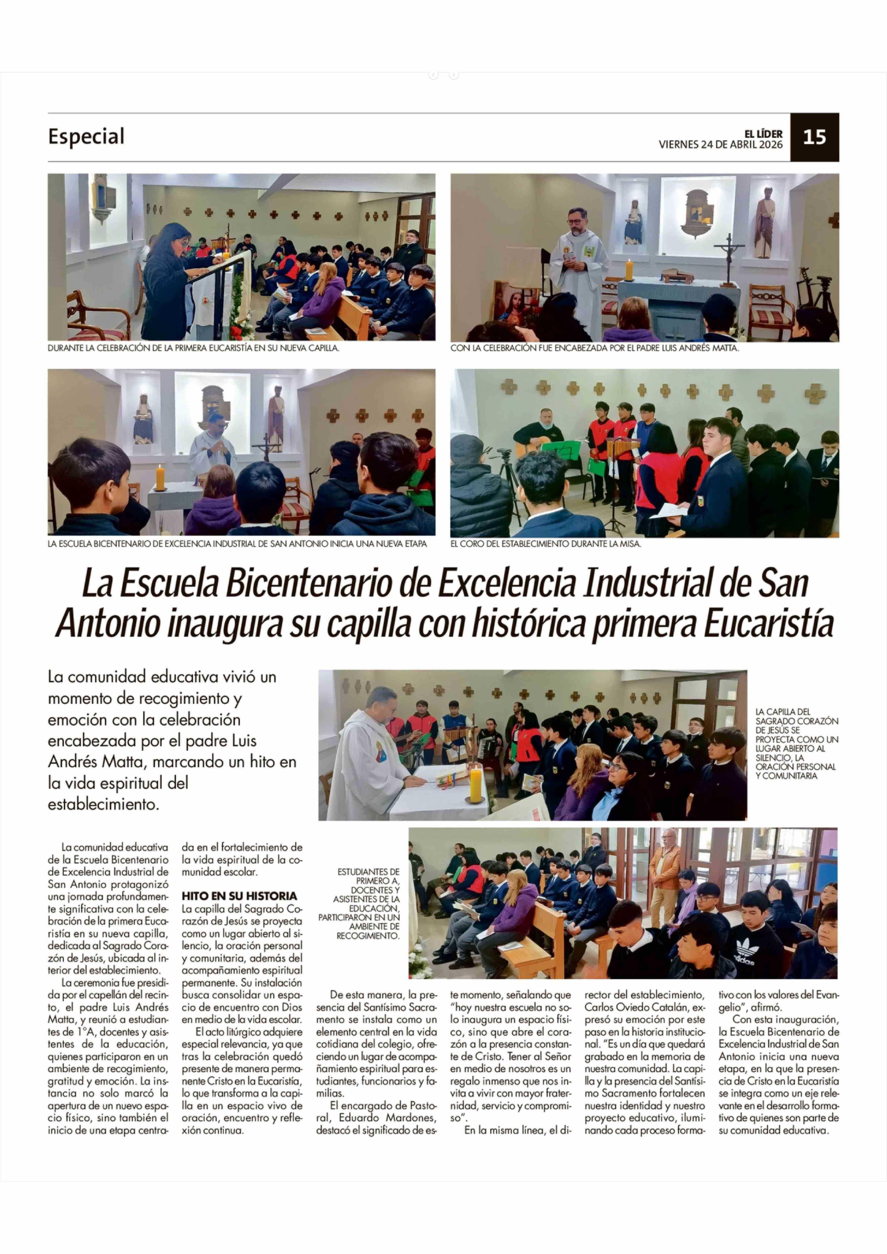 La Escuela Bicentenario de Excelencia Industrial de San Antonio inaugura su capilla con histórica primera Eucaristía 24-04-2026 El Líder |