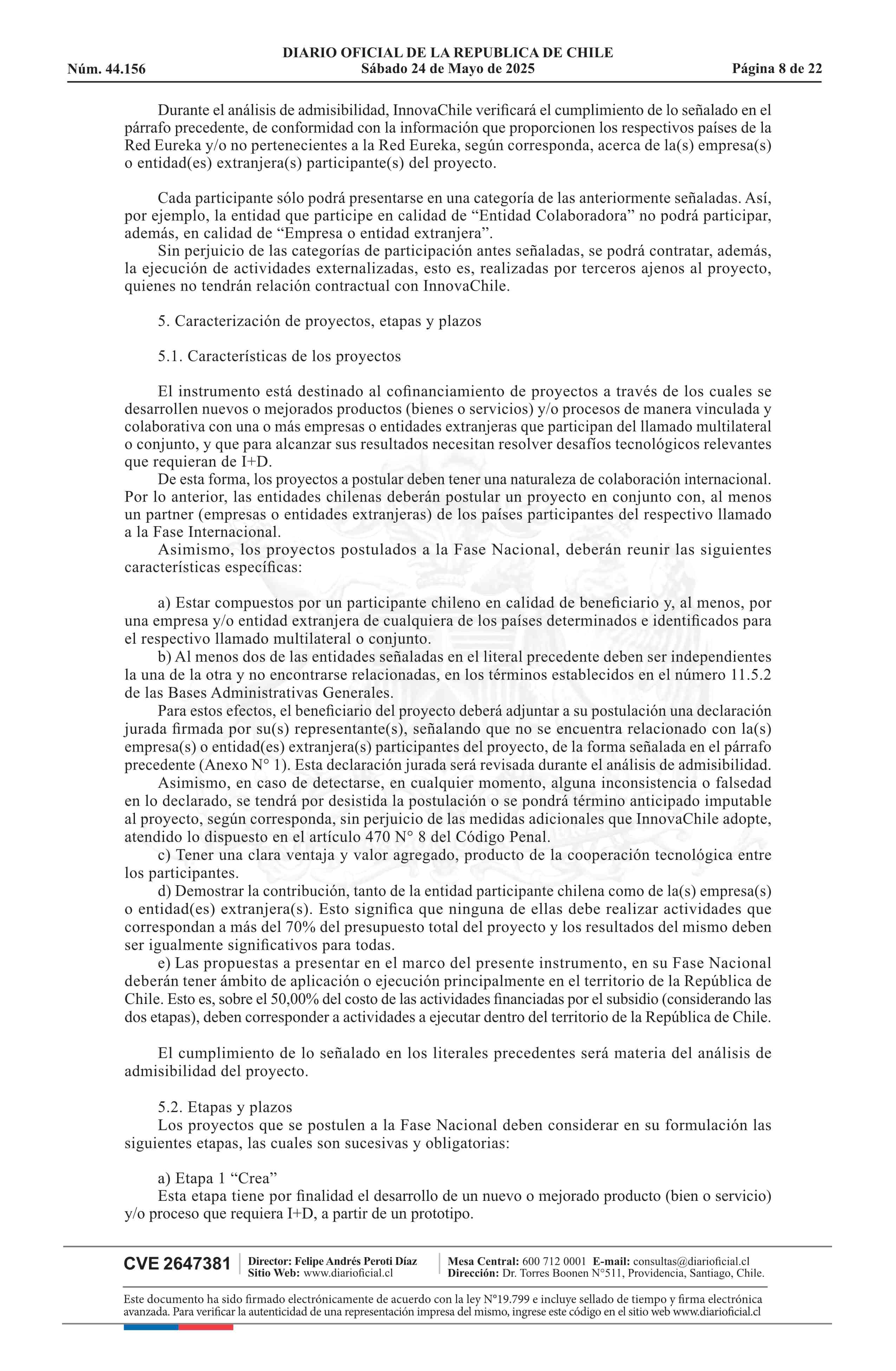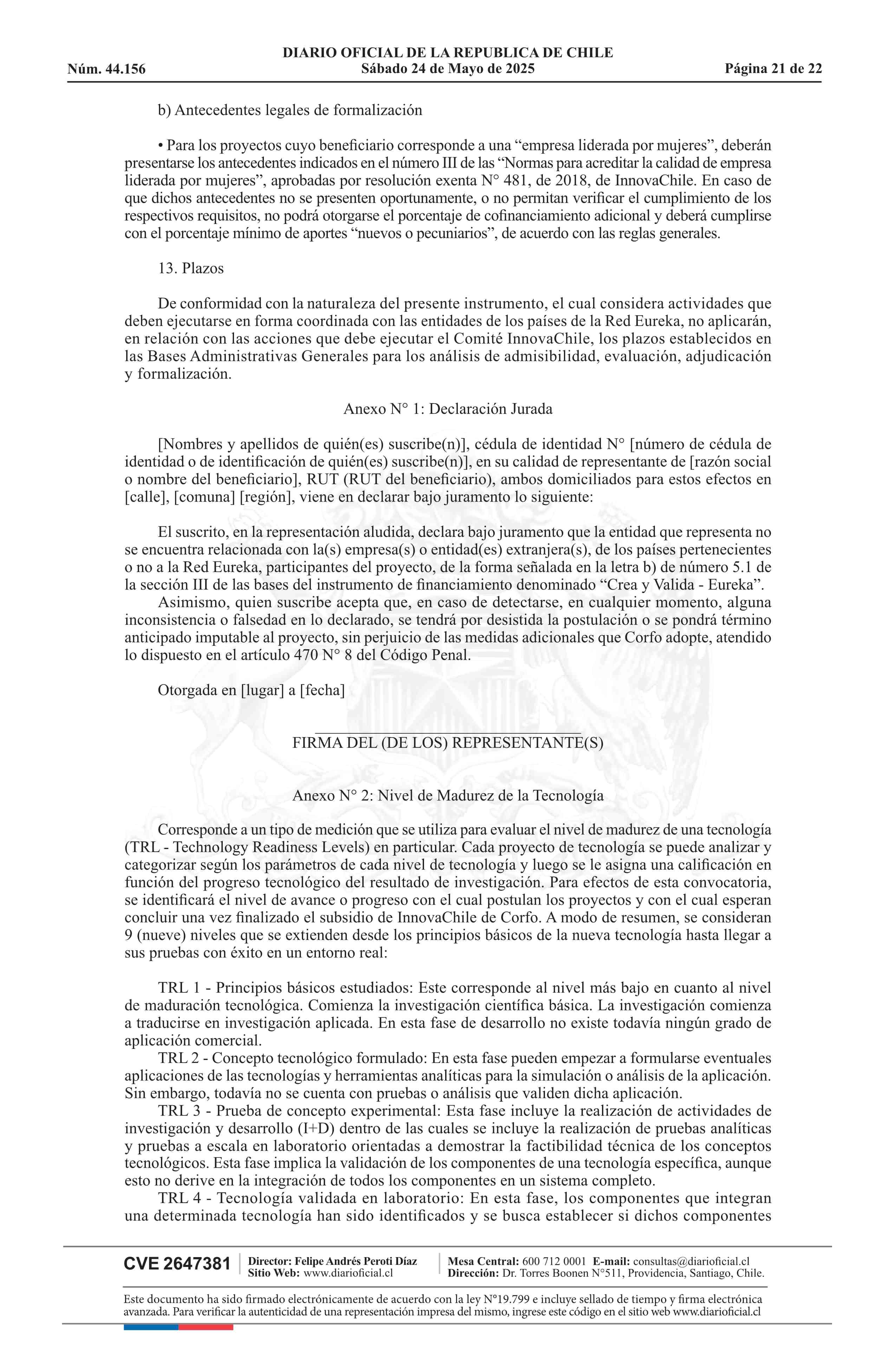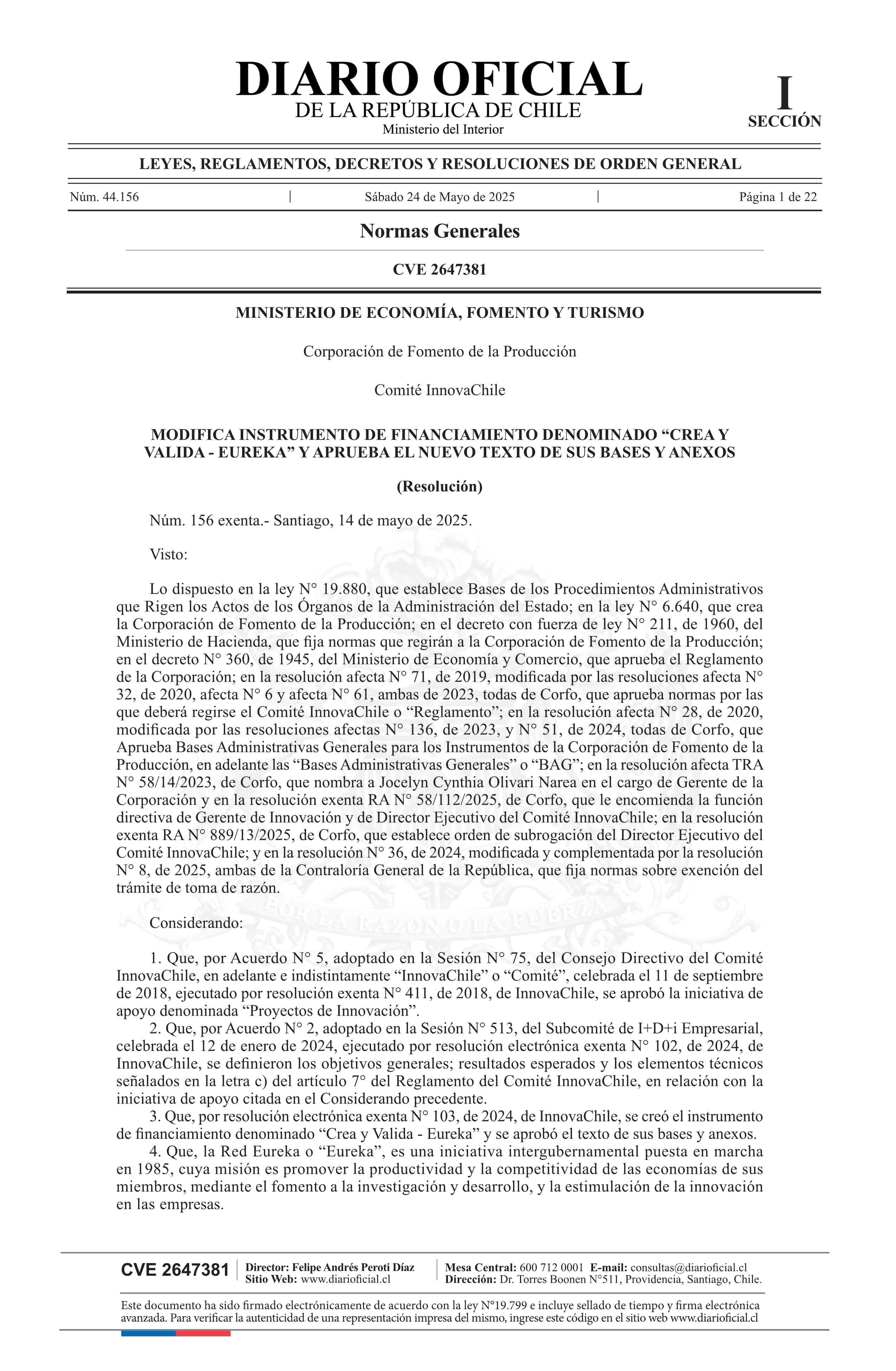 Resolución exenta número 156, de 2025.- Modifica instrumento de financiamiento denominado Crea y Valida - Eureka y aprueba el nuevo texto de sus bases y anexos 24-05-2025 Diario Oficial Edición Electrónica |