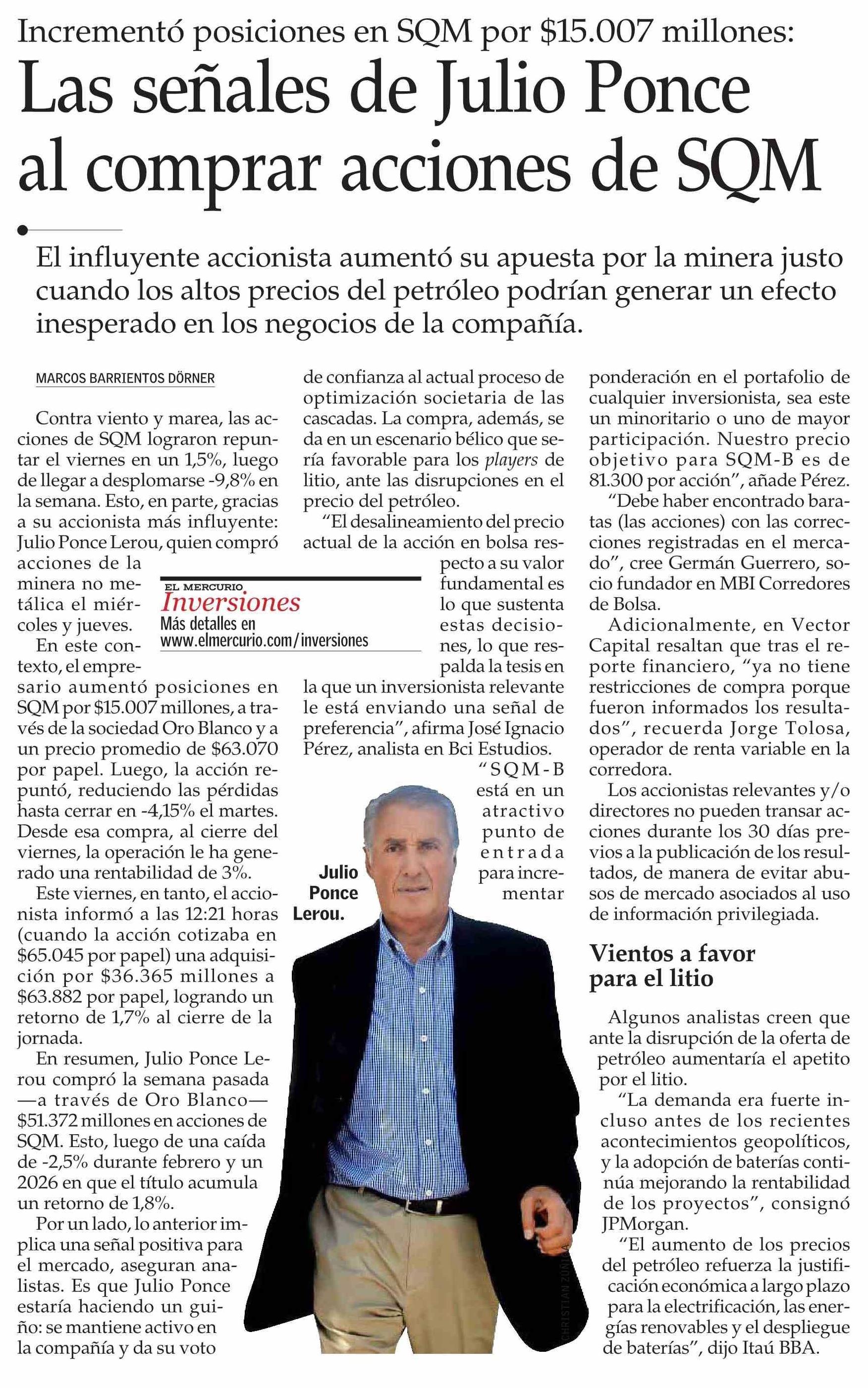 Las señales de Julio Ponce al comprar acciones de SQM 10-03-2026 El Mercurio |