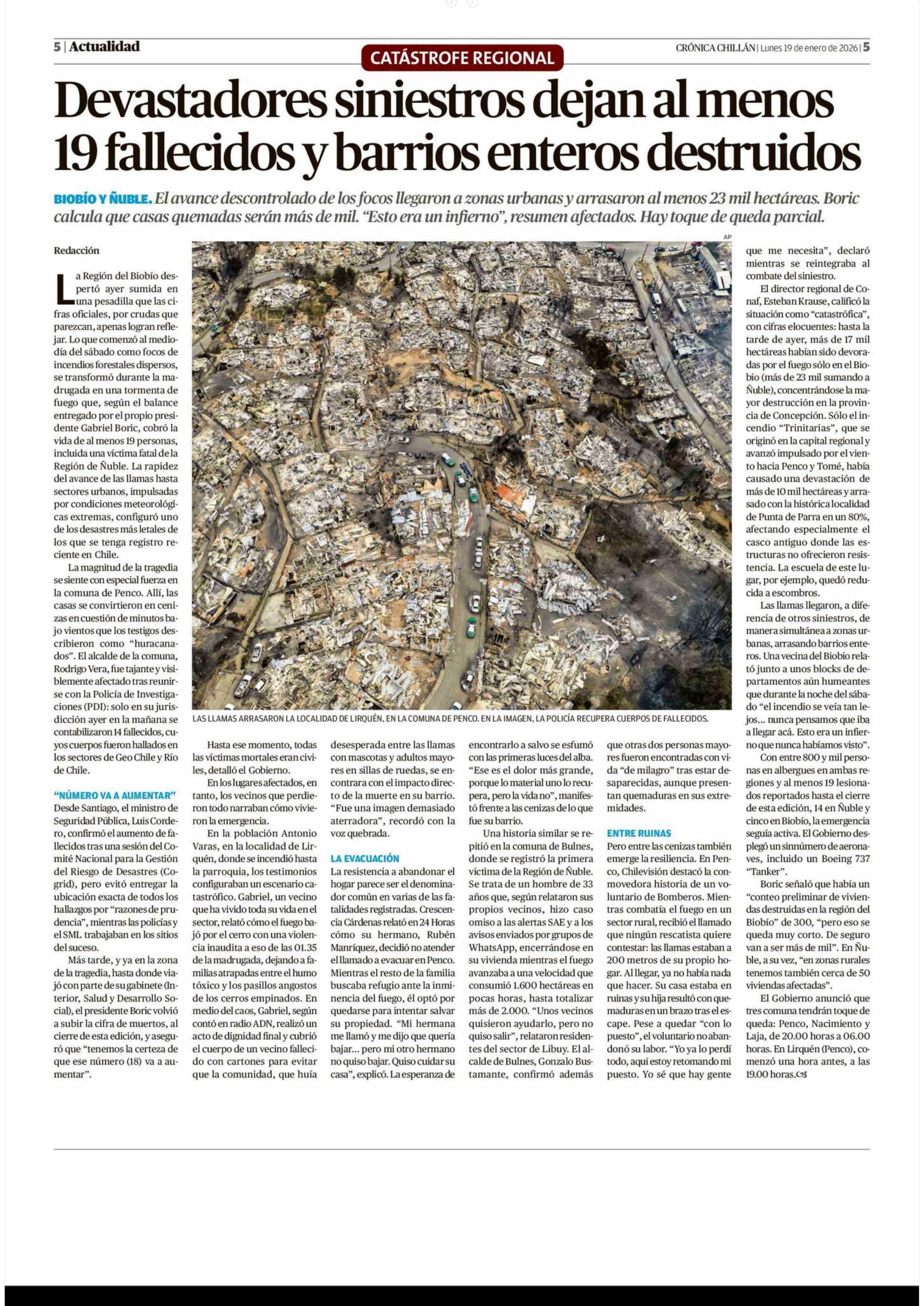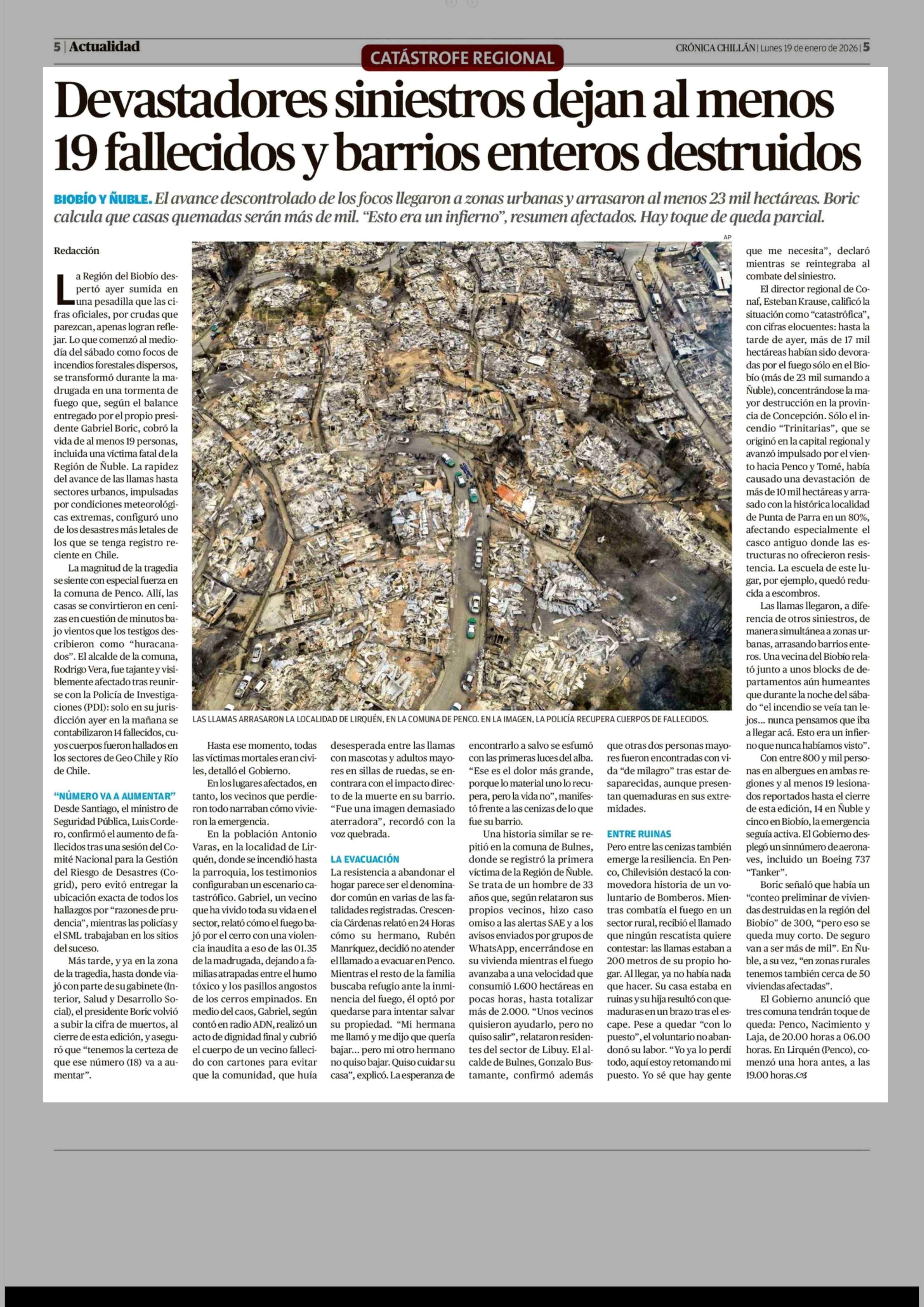 Devastadores siniestros dejan al menos 19 fallecidos y barrios enteros destruidos 19-01-2026 Crónica de Chillán |