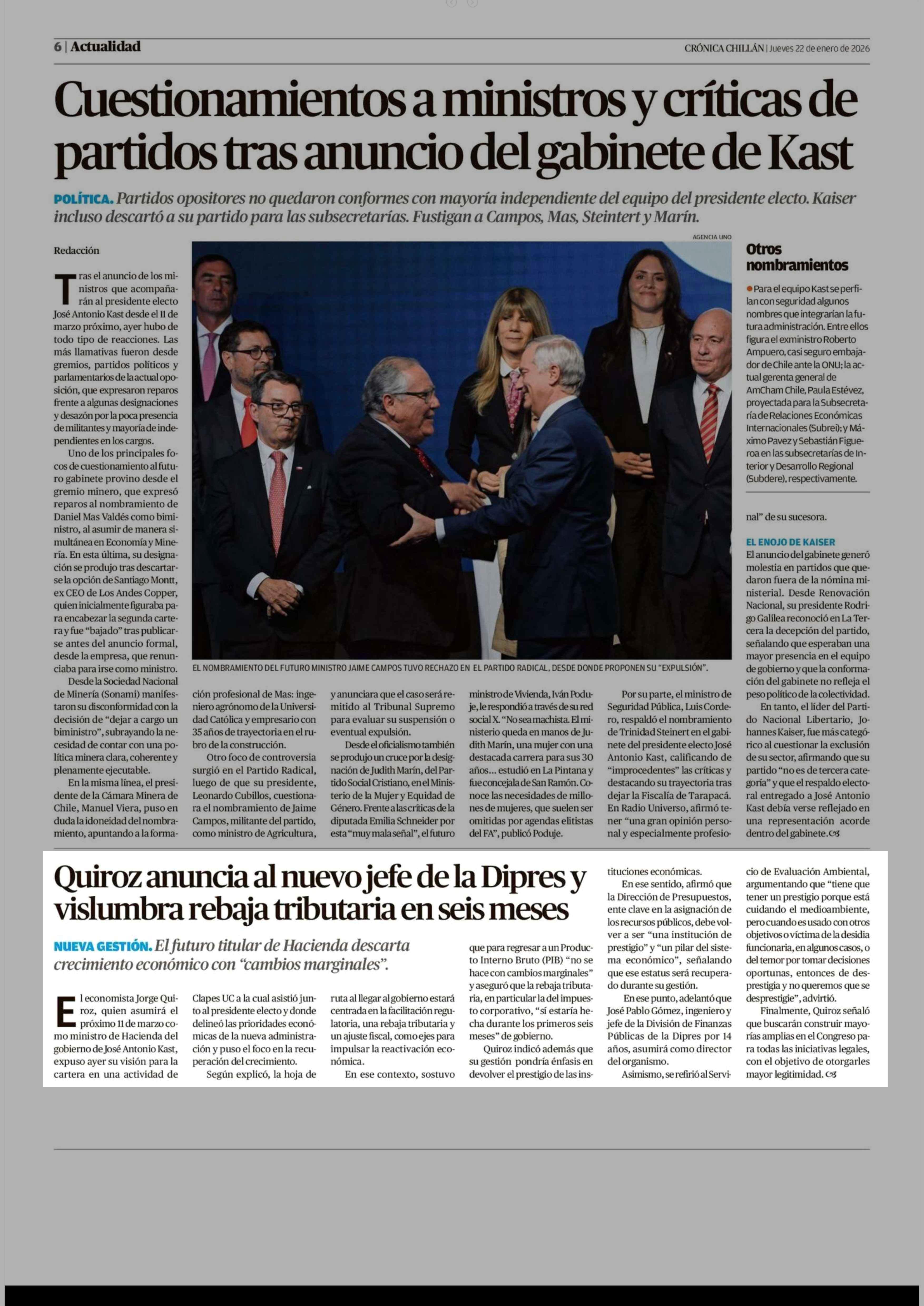 Quiroz anuncia al nuevo jefe de la Dipres y vislumbra rebaja tributaria en seis meses 22-01-2026 Crónica de Chillán |