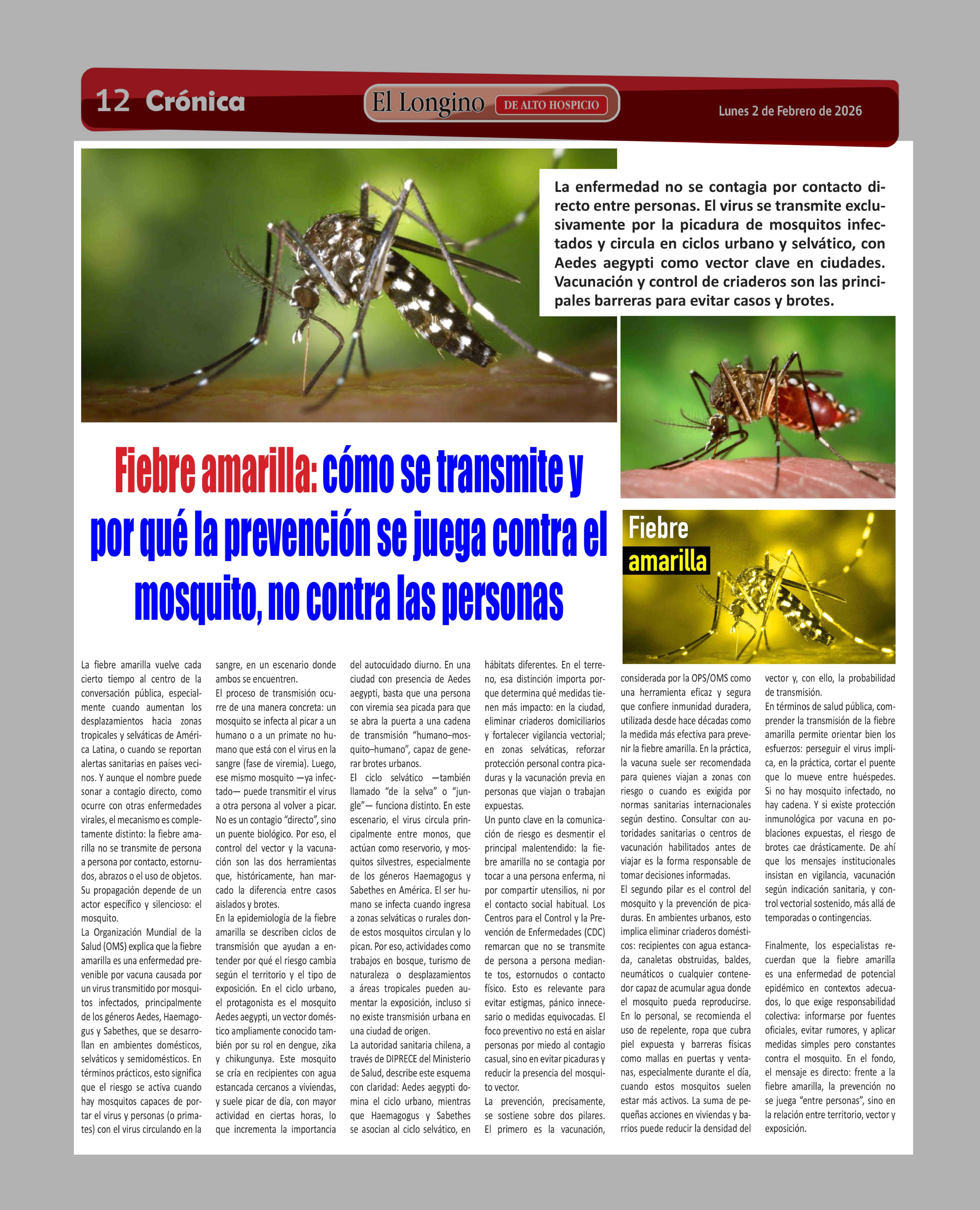 Fiebre amarilla: cómo se transmite y por qué la prevención se juega contra el mosquito, no contra las personas 02-02-2026 El Longino |