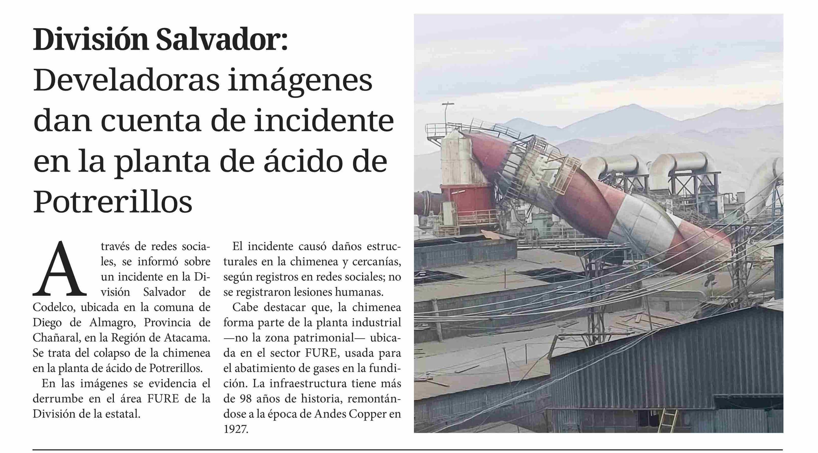 División Salvador: Develadoras imágenes dan cuenta de incidente en la planta de ácido de Potrerillos 15-06-2025 Diario Chañarcillo |