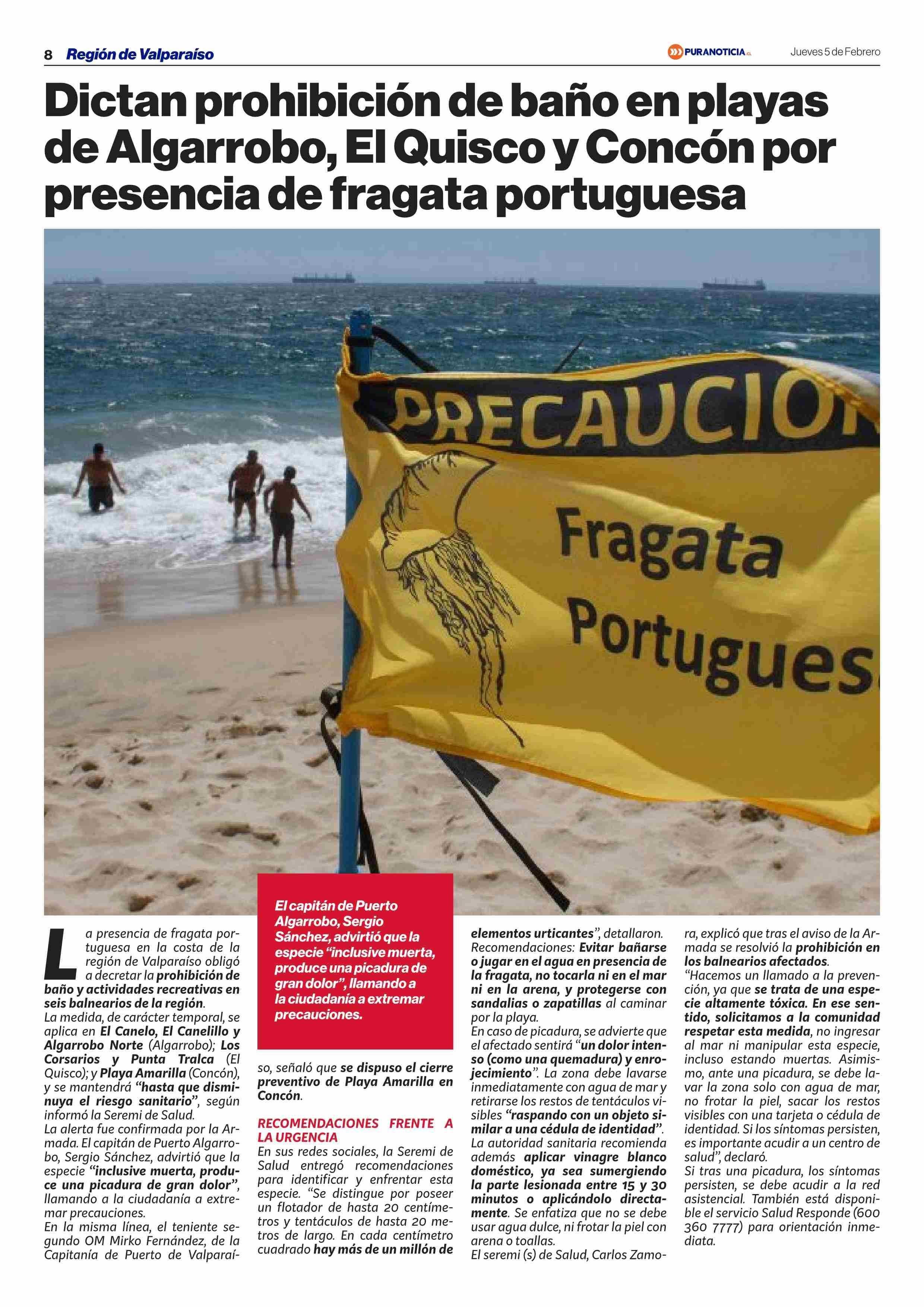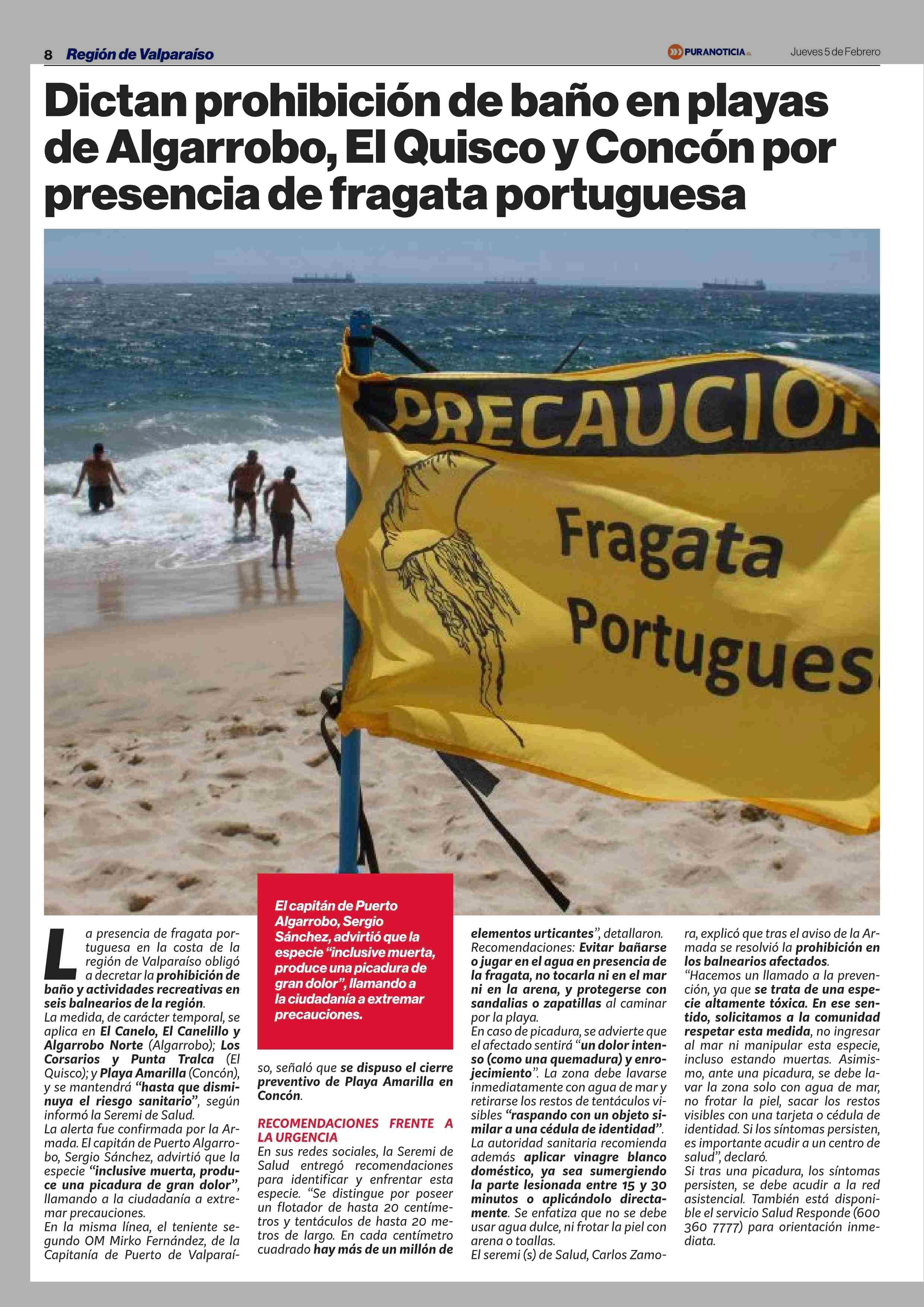 Título: Dictan prohibición de baño en playas de Algarrobo, El Quisco y Concón por presencia de fragata portuguesa
