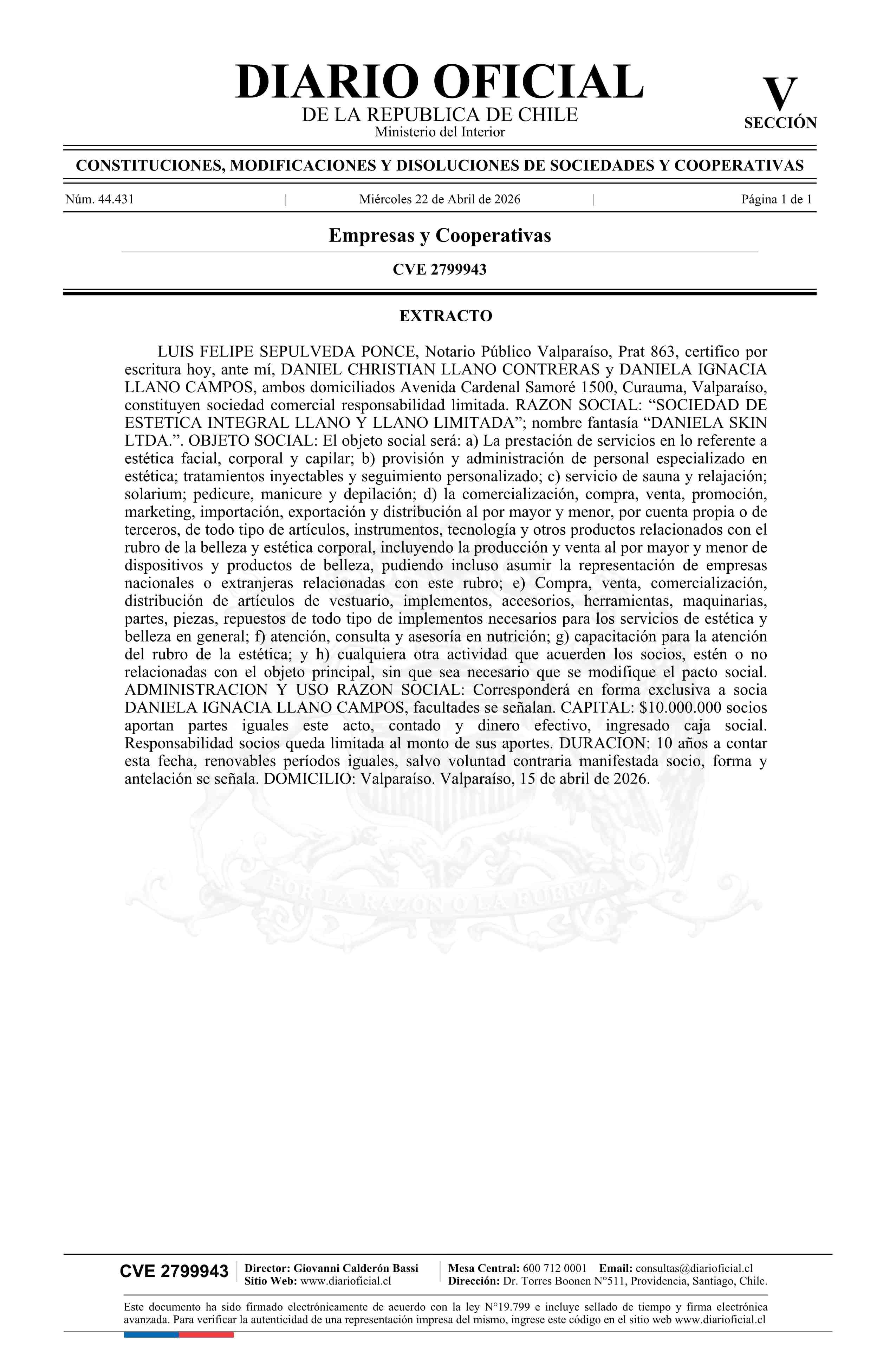 Título: SOCIEDAD DE ESTETICA INTEGRAL LLANO Y LLANO LIMITADA