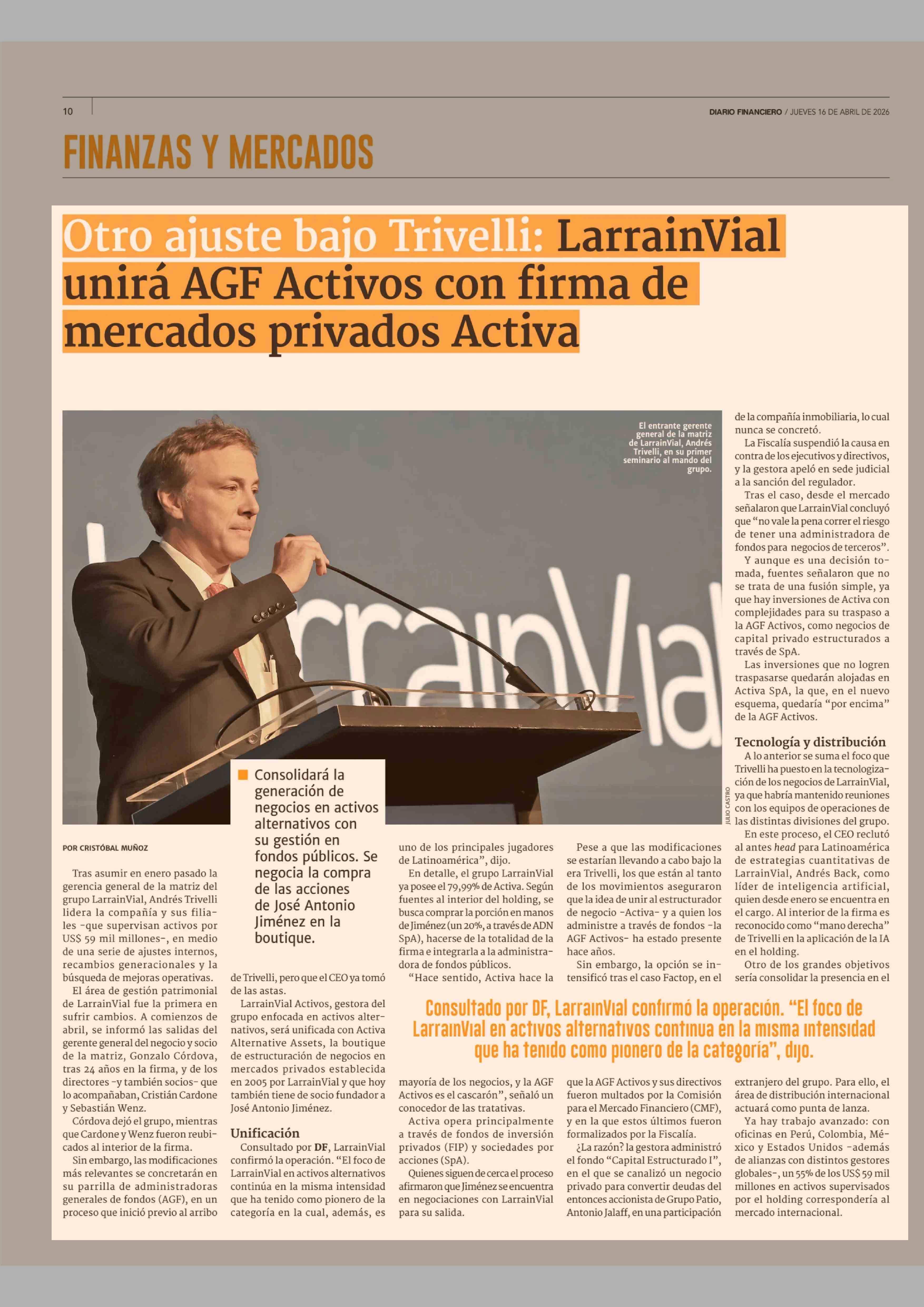 Otro ajuste bajo Trivelli: LarrainVial unirá AGF Activos con firma de mercados privados Activa 16-04-2026 Diario Financiero |