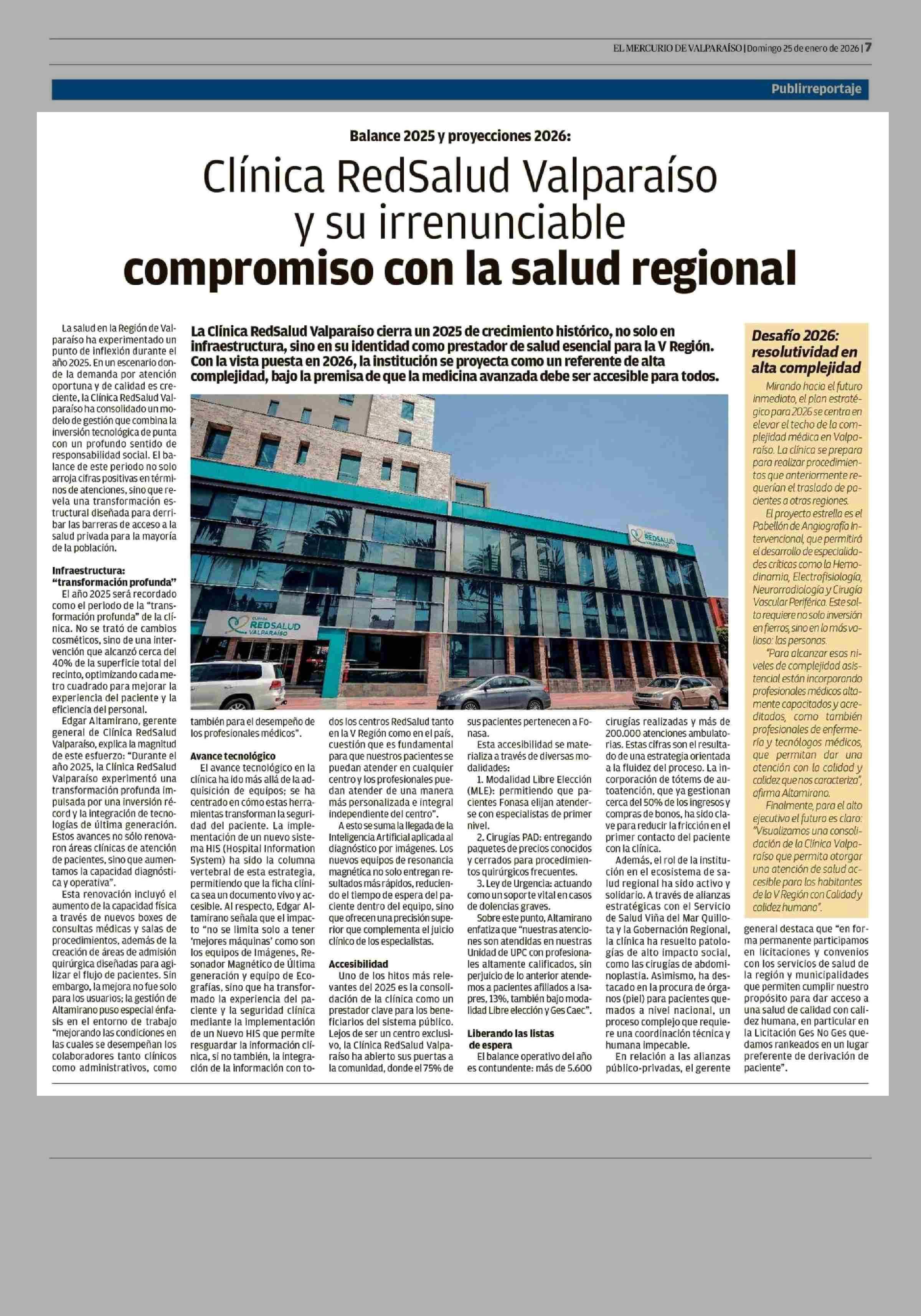 Clínica RedSalud Valparaíso y su irrenunciable compromiso con la salud regional 25-01-2026 El Mercurio de Valparaíso |