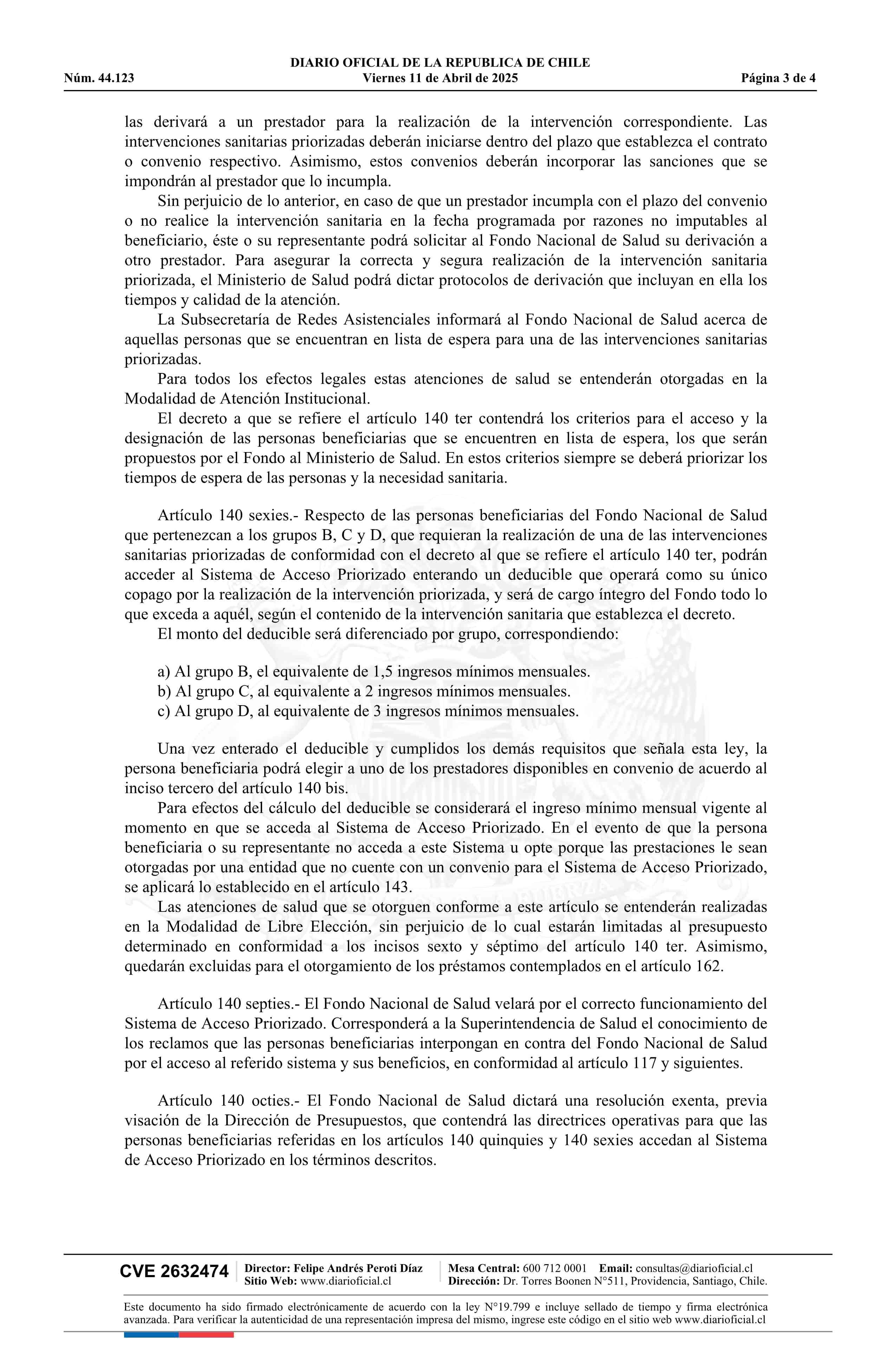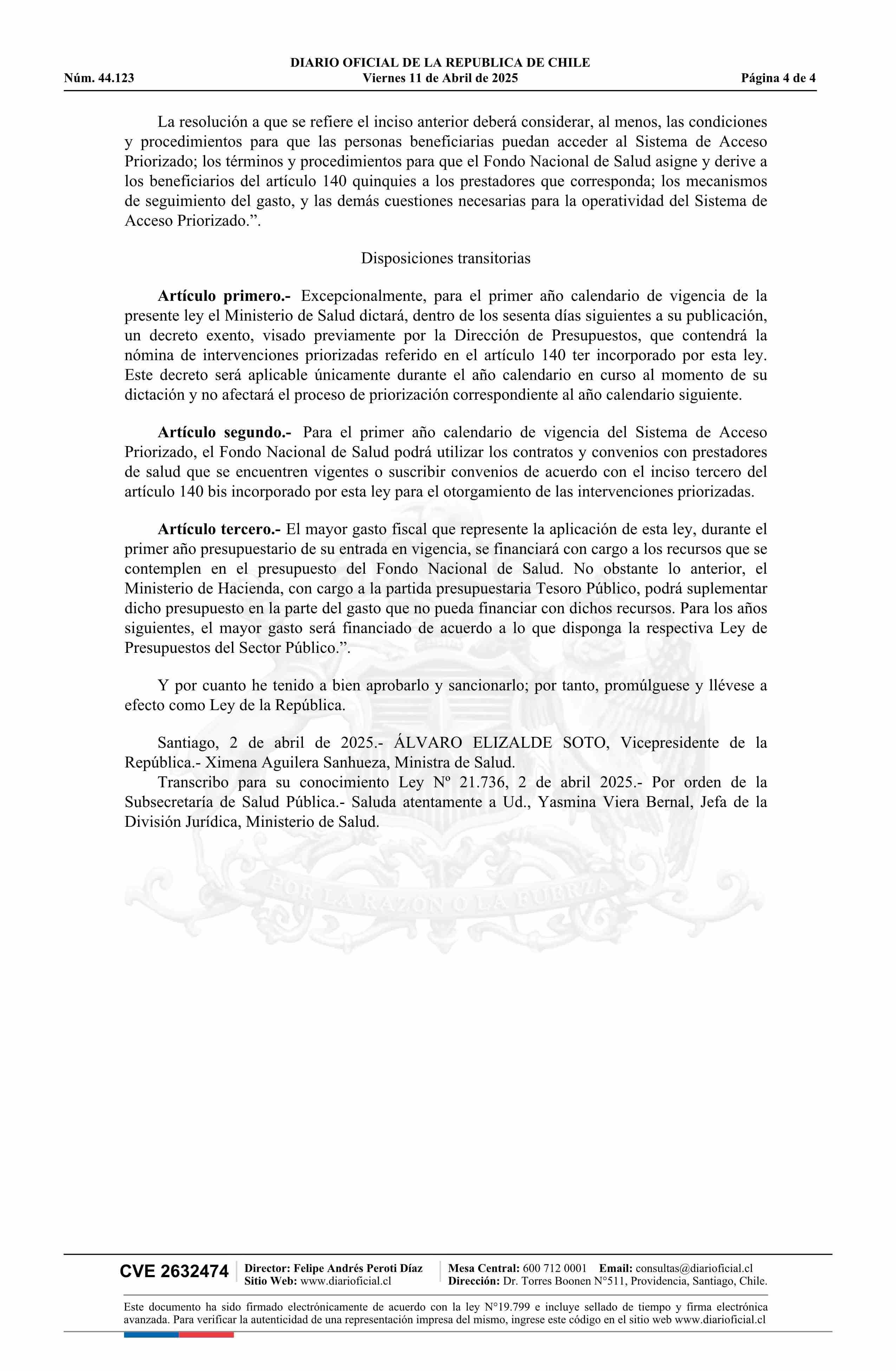 Ley número 21.736.- Crea el Sistema de Acceso Priorizado del Fondo Nacional de Salud y modifica el decreto con fuerza de ley Nº 1, de 2005, del Ministerio de Salud 11-04-2025 Diario Oficial Edición Electrónica |