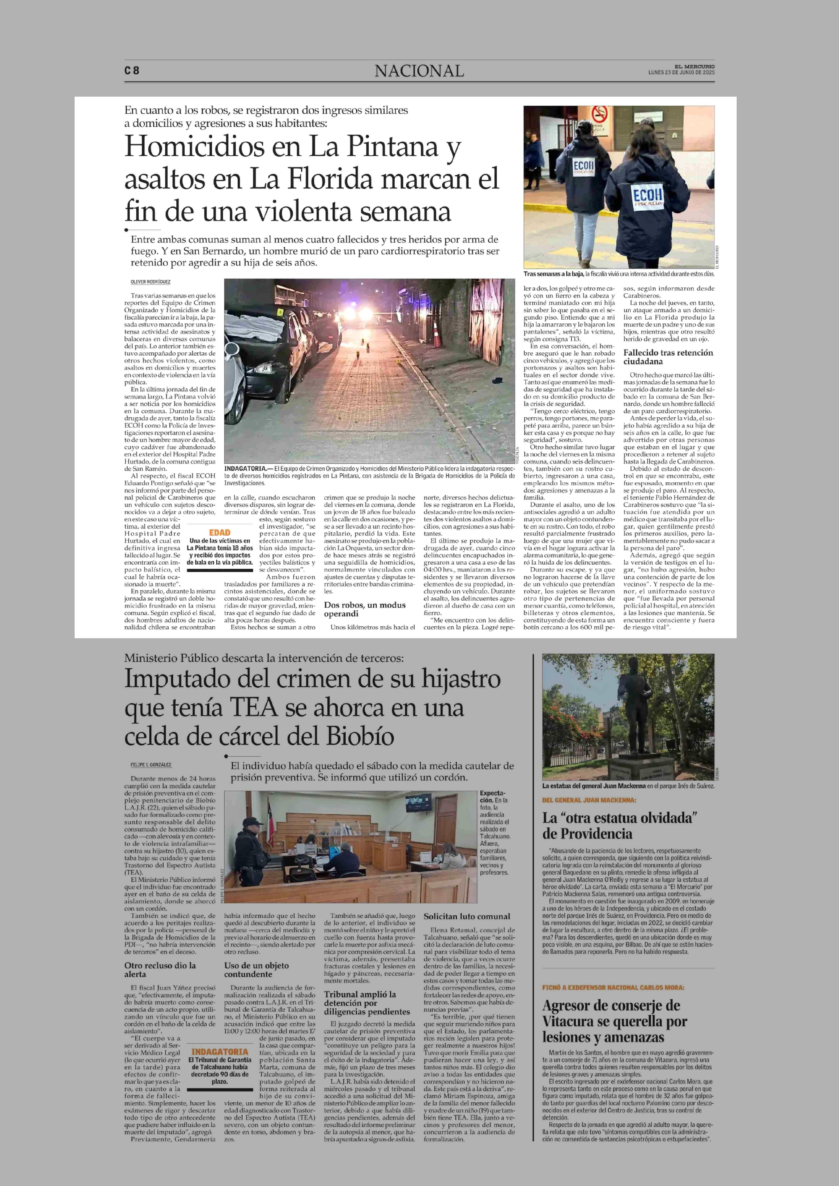 Homicidios en La Pintana y asaltos en La Florida marcan el fin de una violenta semana 23-06-2025 El Mercurio |