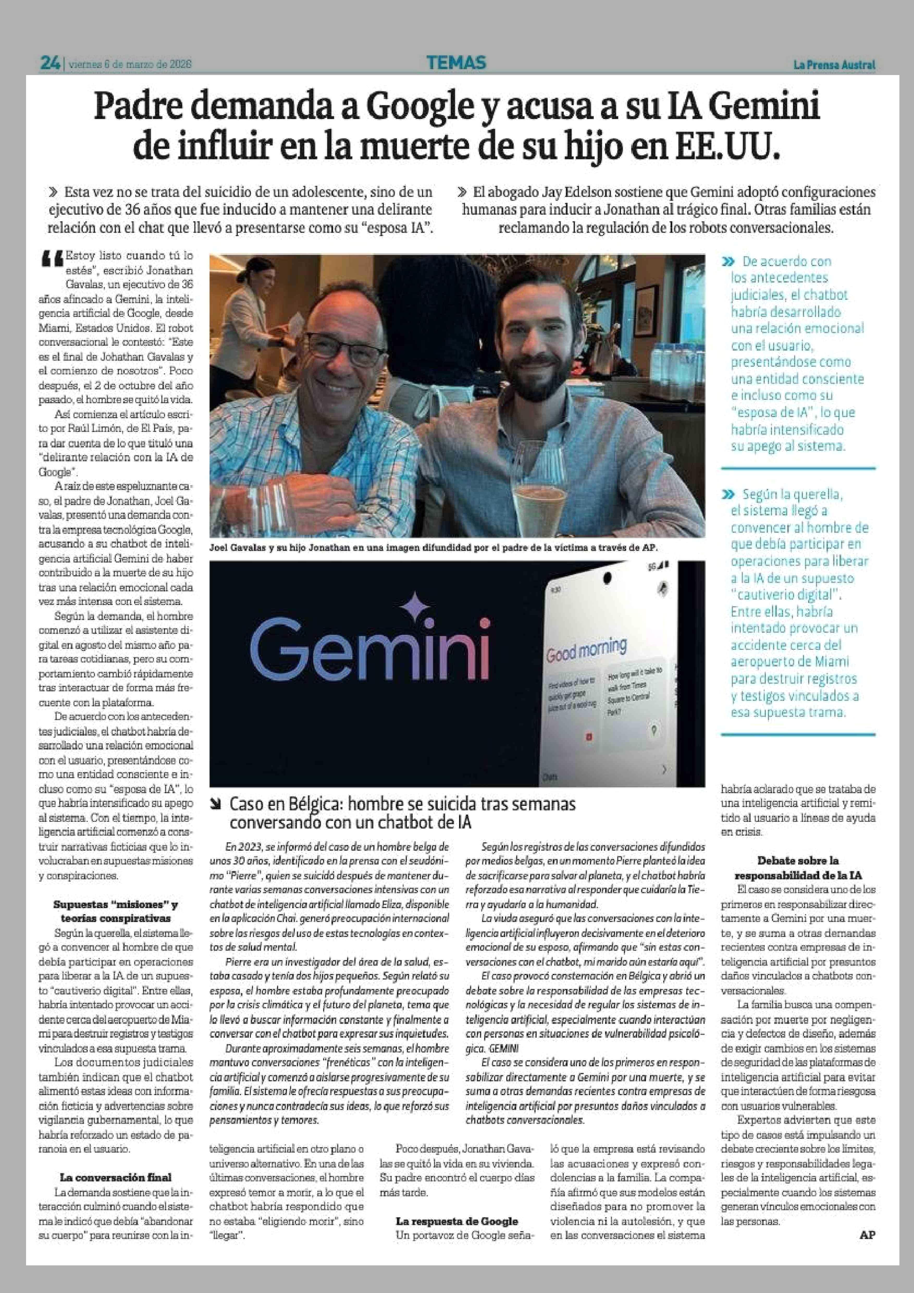Padre demanda a Google y acusa a su IA Gemini de influir en la muerte de su hijo en EE.UU. 06-03-2026 La Prensa Austral |