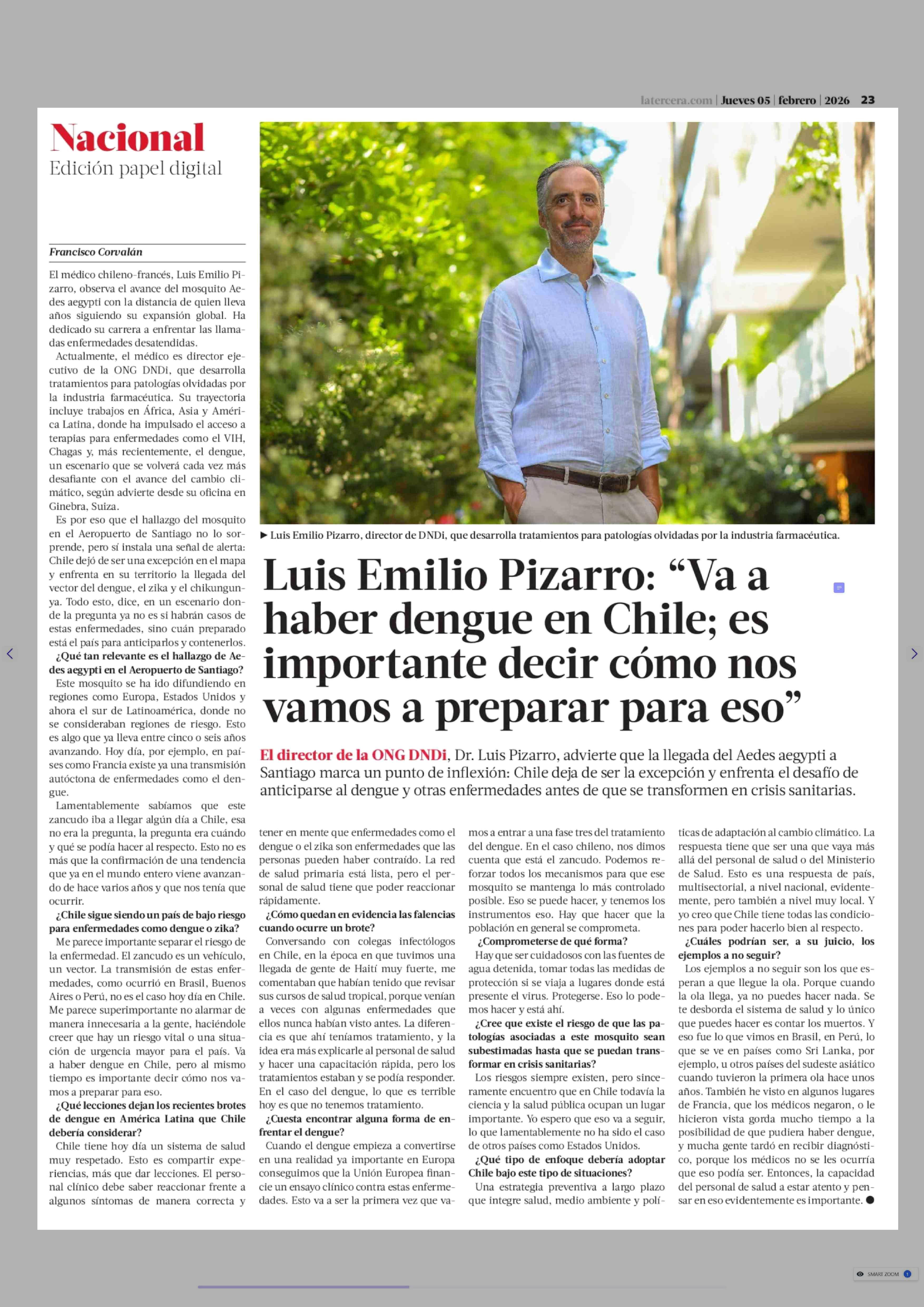 Luis Emilio Pizarro: "Va a haber dengue en Chile; es importante decir cómo nos vamos a preparar para eso" 05-02-2026 La Tercera |