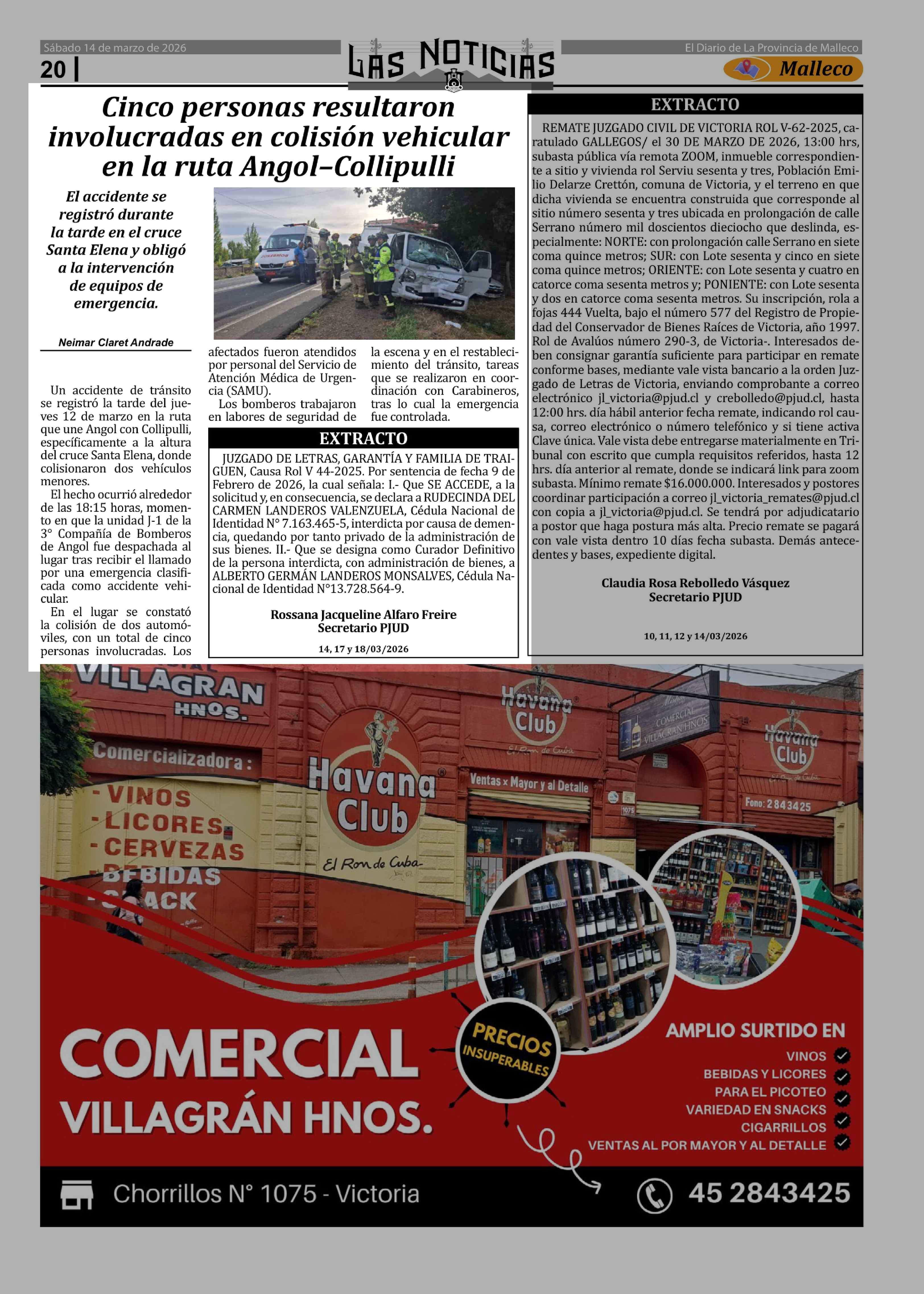 Cinco personas resultaron involucradas en colisión vehicular en la ruta Angol-Collipulli 14-03-2026 Las Noticias |