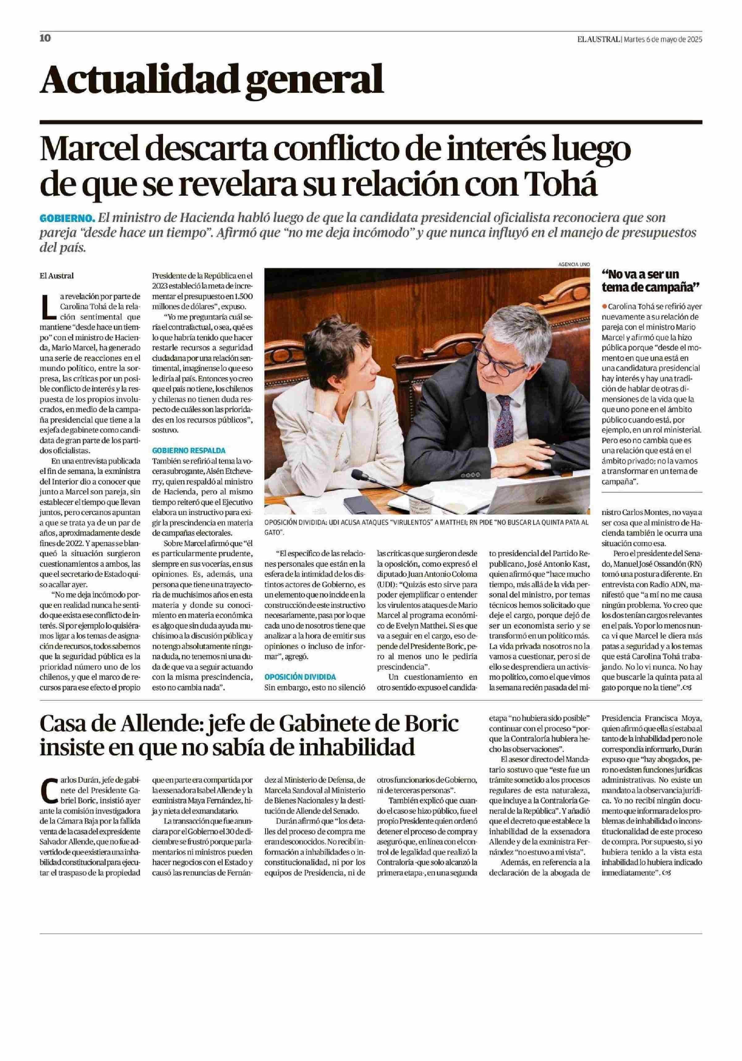 Casa de Allende: jefe de Gabinete de Boric insiste en que no sabía de inhabilidad 06-05-2025 El Austral de la Araucanía |