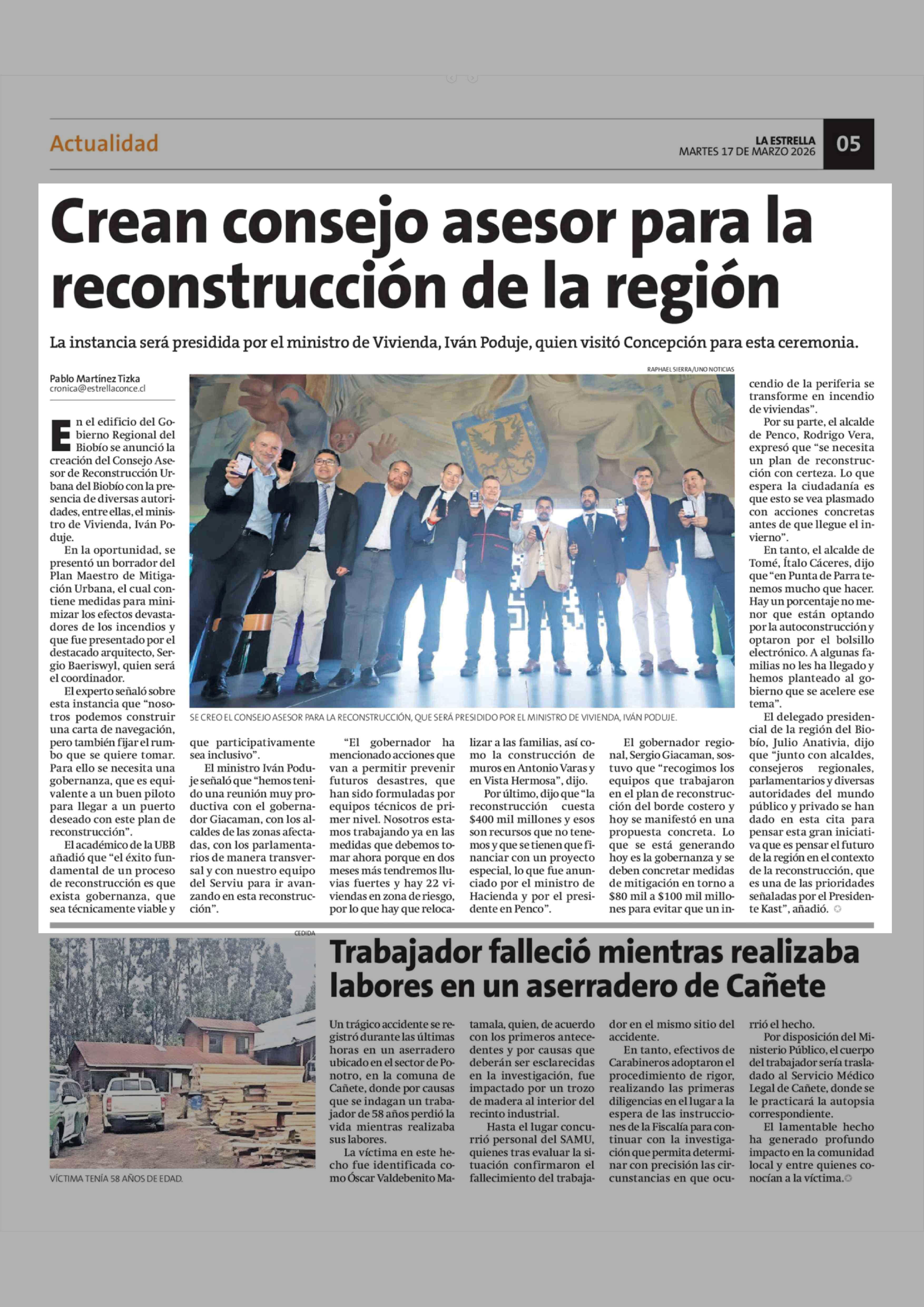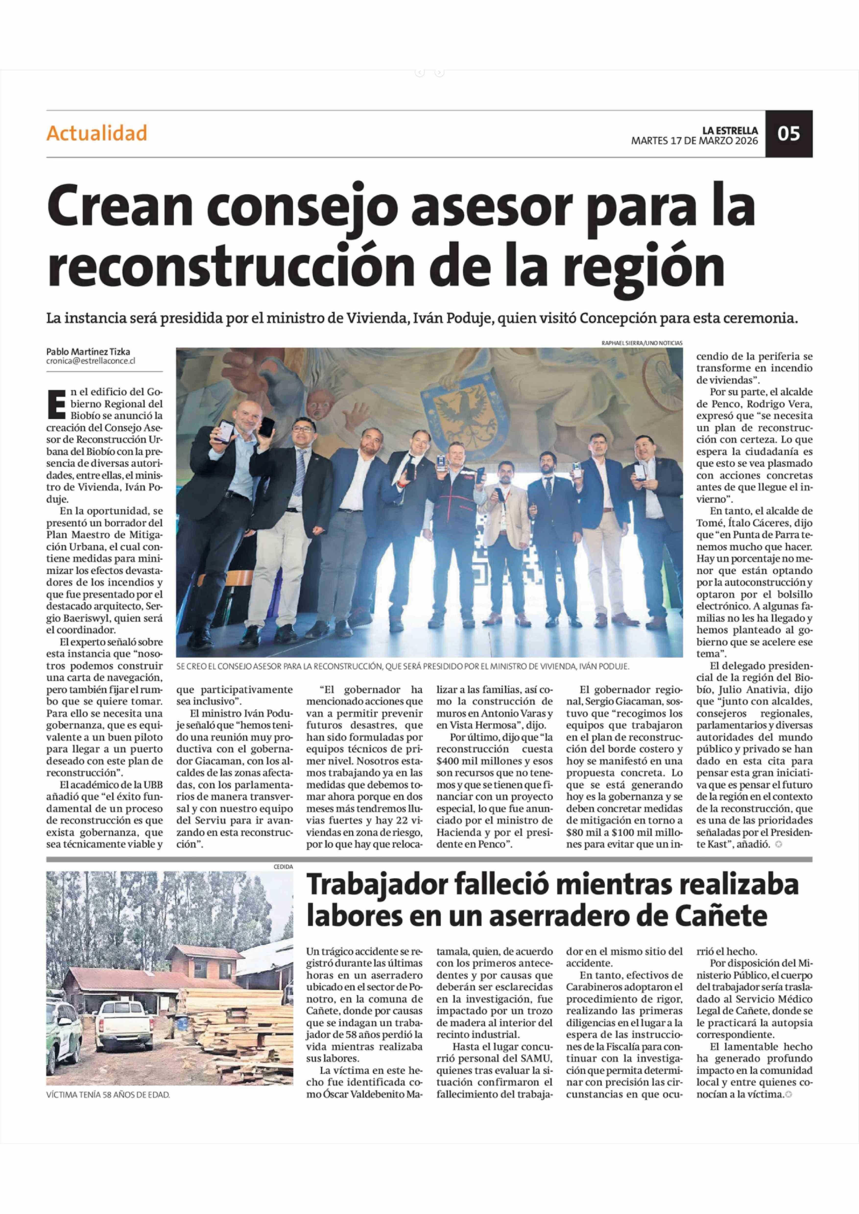 Crean consejo asesor para la reconstrucción de la región 17-03-2026 La Estrella de Concepción |