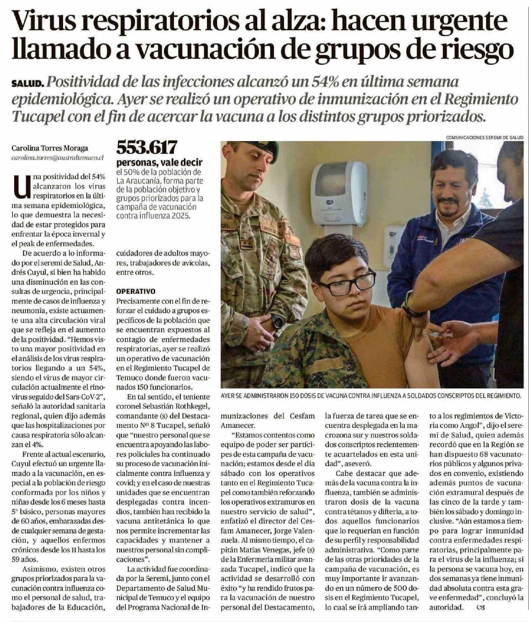 Virus respiratorios al alza: hacen urgente llamado a vacunación de grupos de riesgo 10-04-2025 El Austral de la Araucanía |