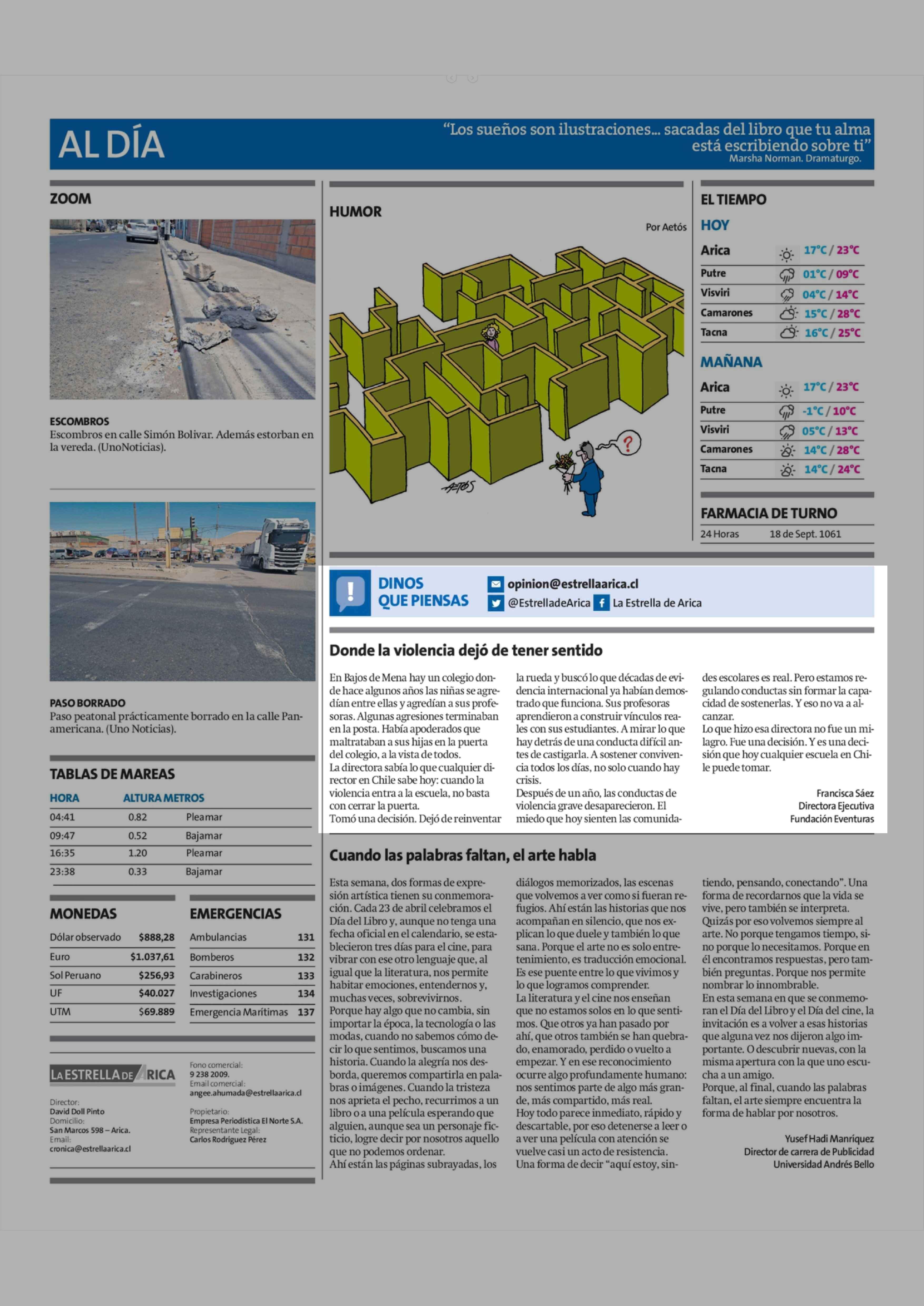 Columnas de Opinión: Donde la violencia dejó de tener sentido 24-04-2026 La Estrella de Arica |