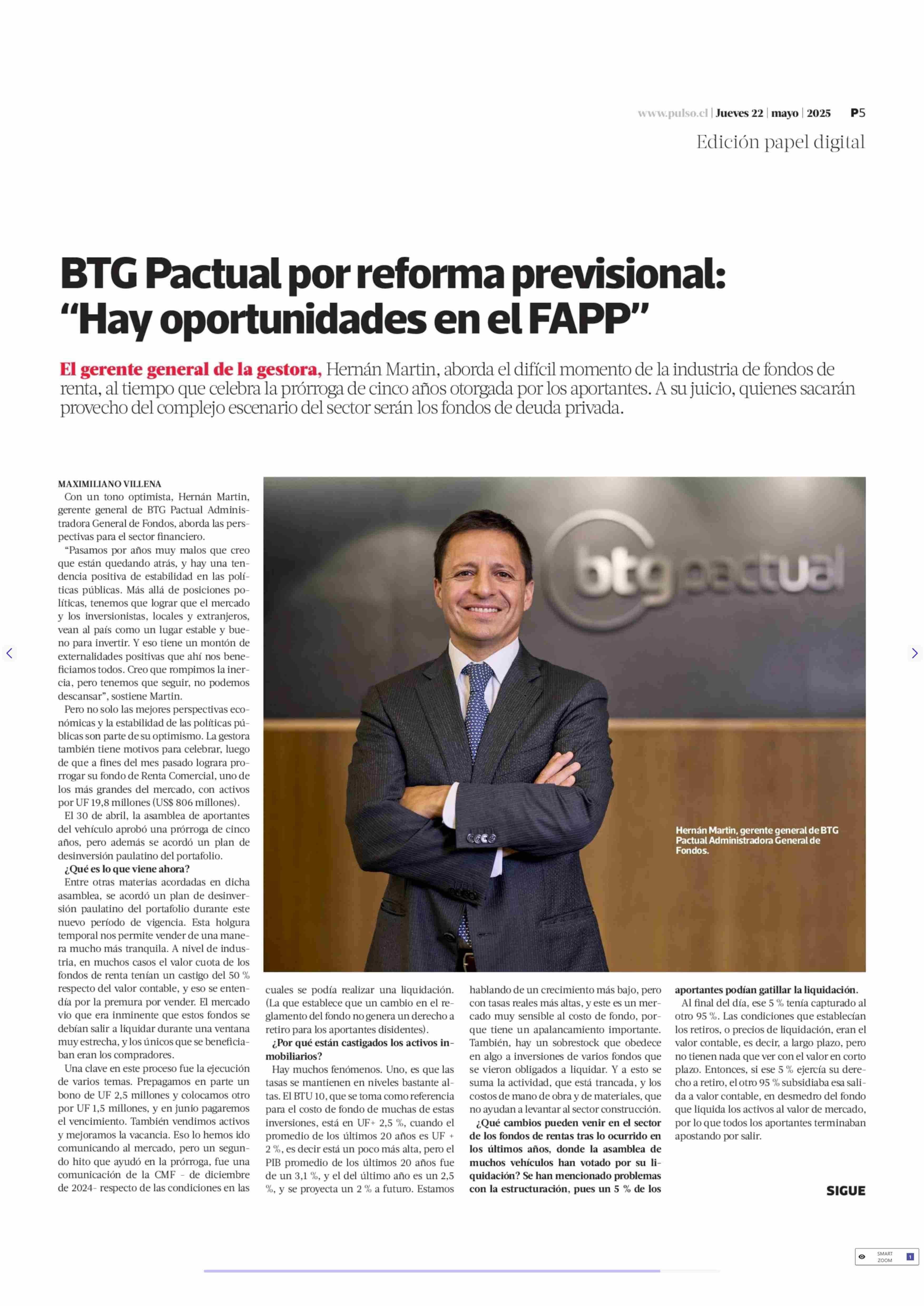 BTG Pactual por reforma previsional: “Hay oportunidades en el FAPP” 22-05-2025 La Tercera |