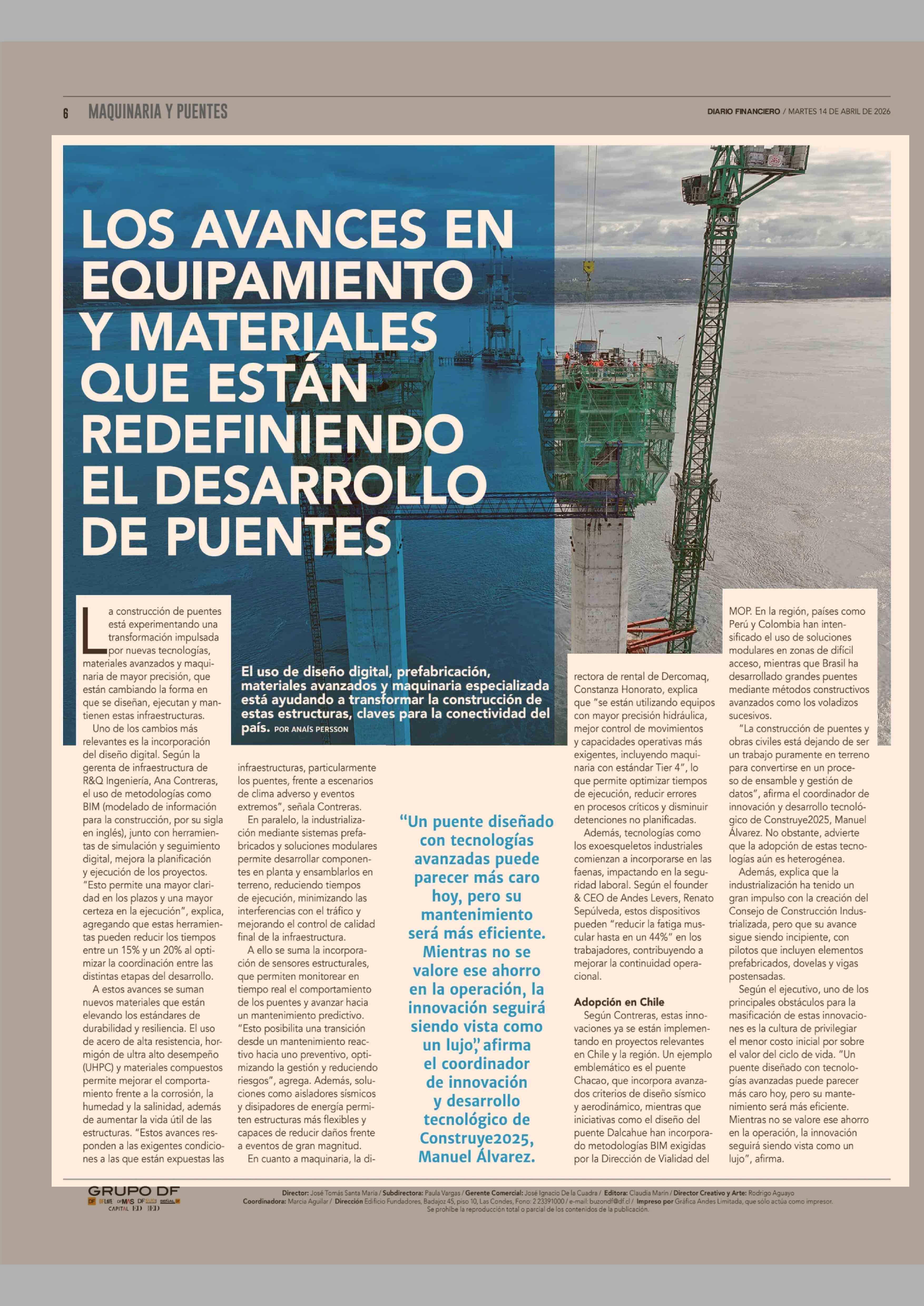 LOS AVANCES EN EQUIPAMIENTO Y MATERIALES QUE ESTAN REDEFINIENDO EL DESARROLLO DE PUENTES 14-04-2026 Diario Financiero |