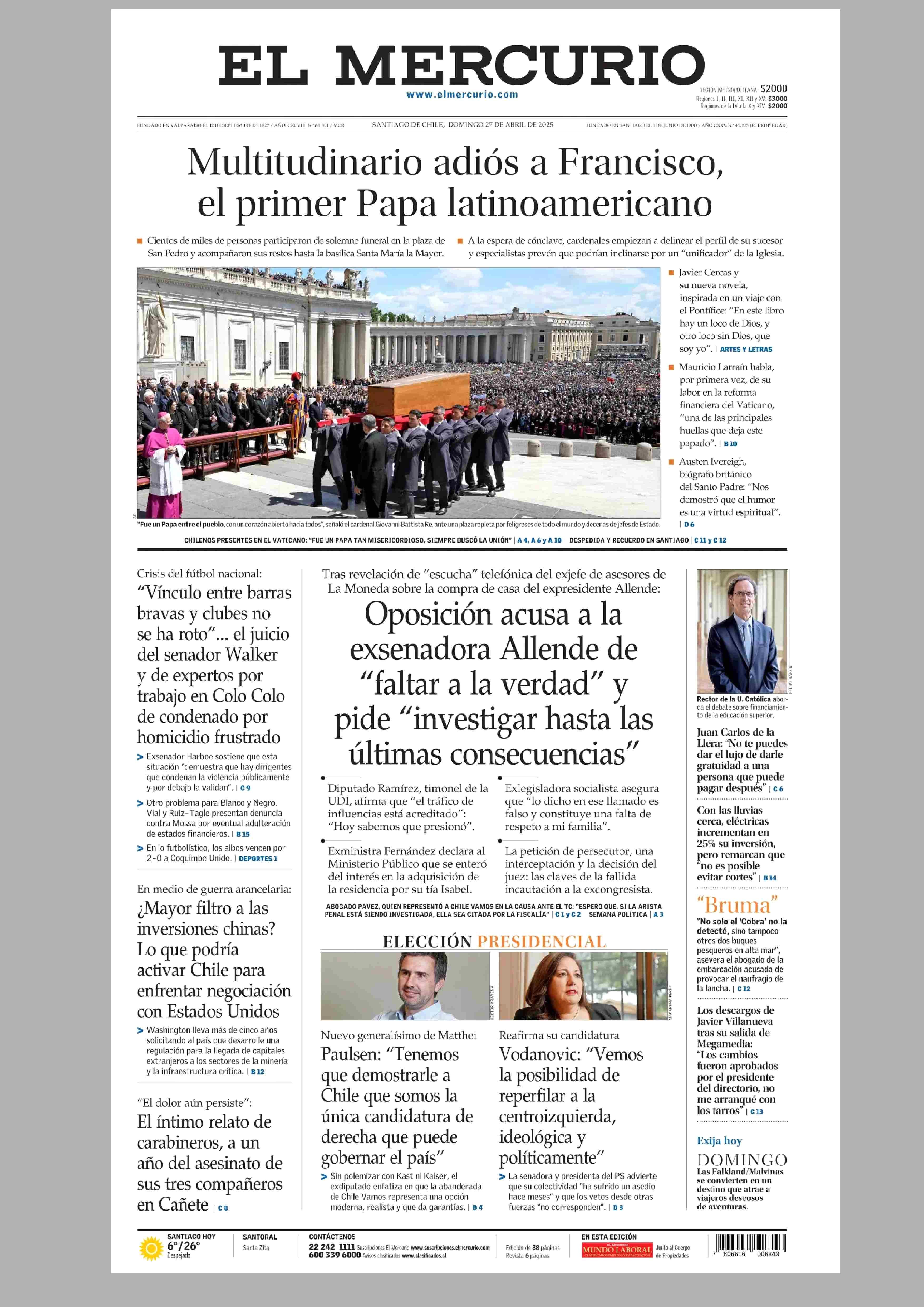 PORTADA EL MERCURIO (A) - CHILE 27-04-2025 El Mercurio |