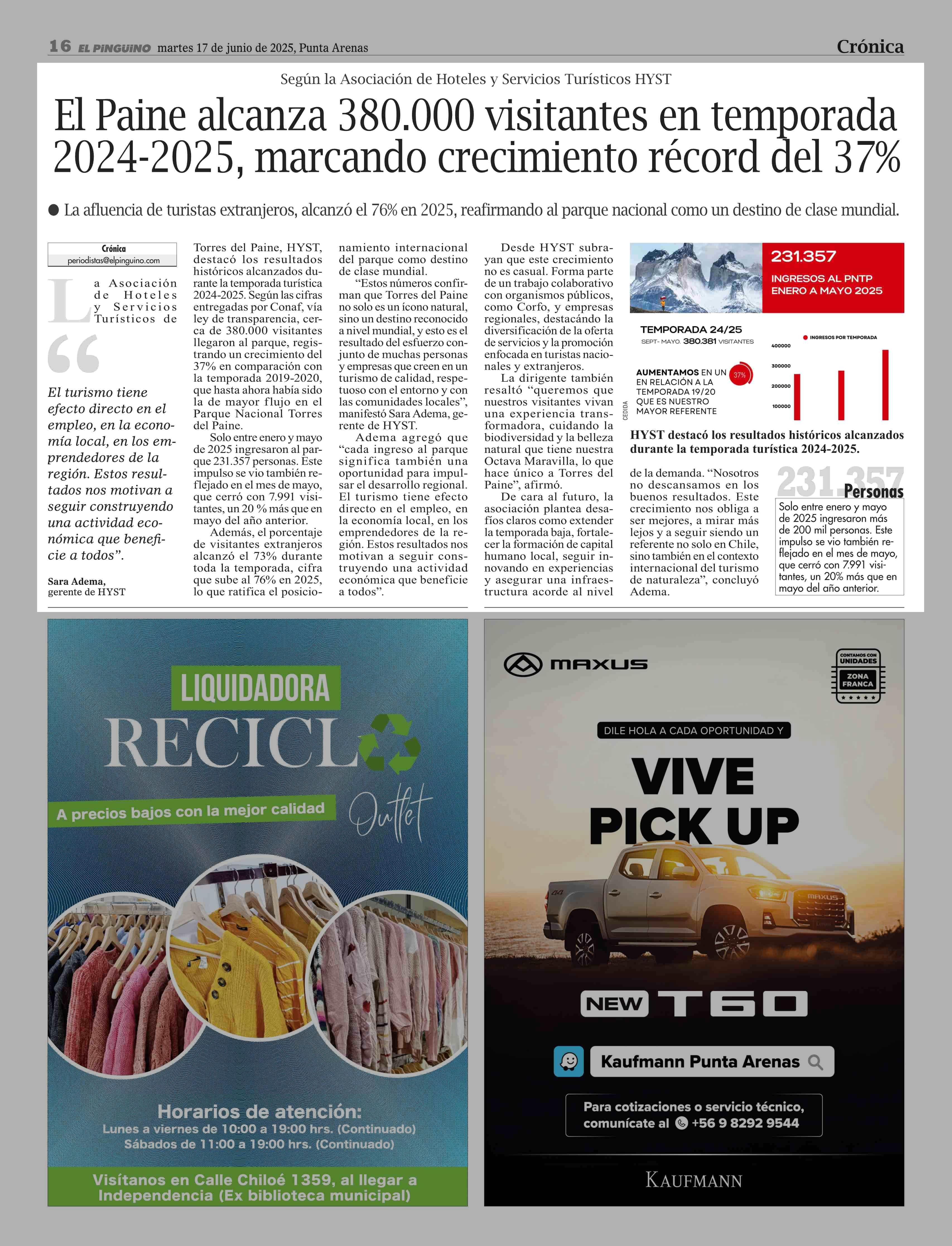 El Paine alcanza 380.000 visitantes en temporada 2024-2025, marcando crecimiento récord del 37% 17-06-2025 El Pingüino |