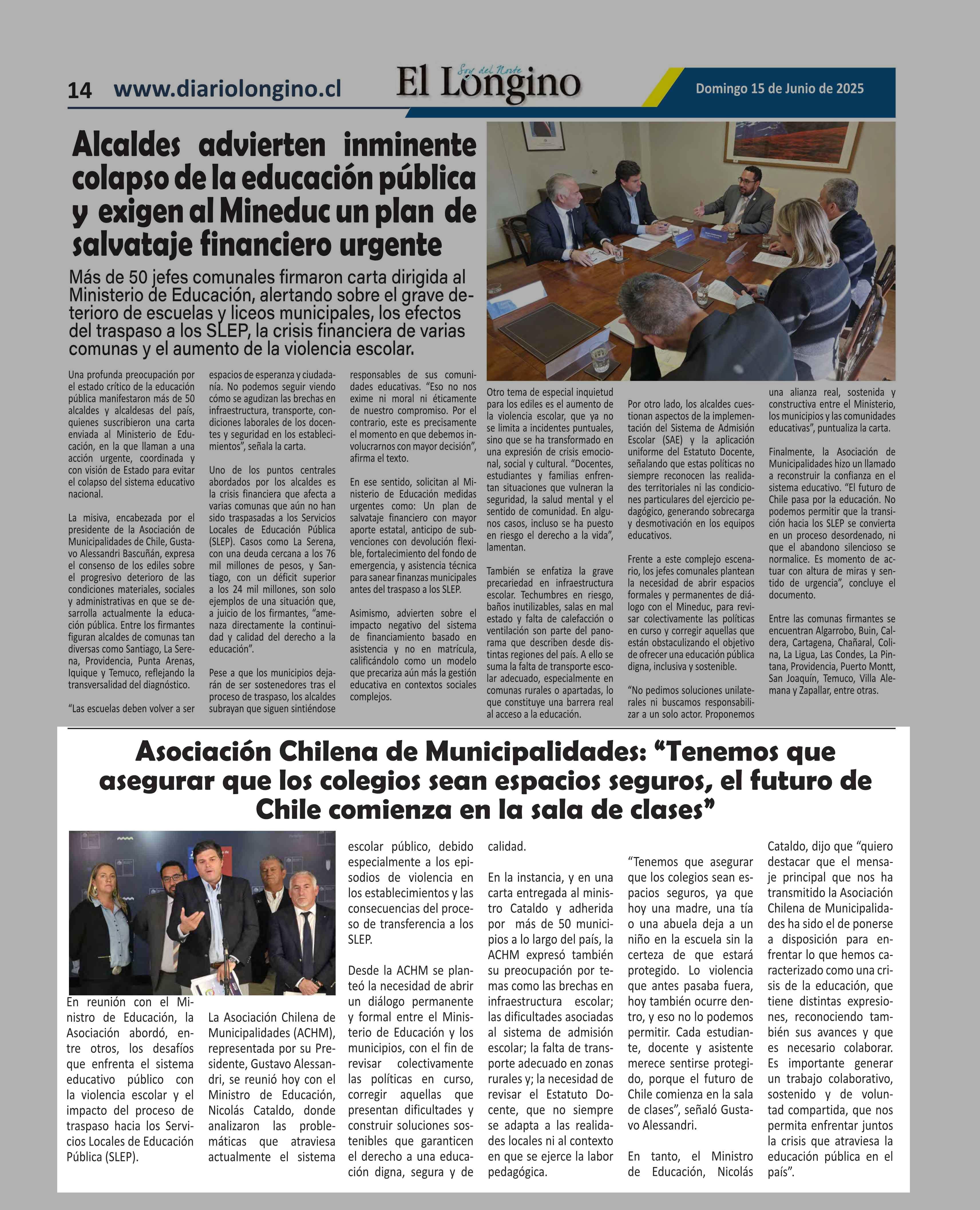 Asociación Chilena de Municipalidades: “Tenemos que asegurar que los colegios sean espacios seguros, el futuro de Chile comienza en la sala de clases” 15-06-2025 El Longino |