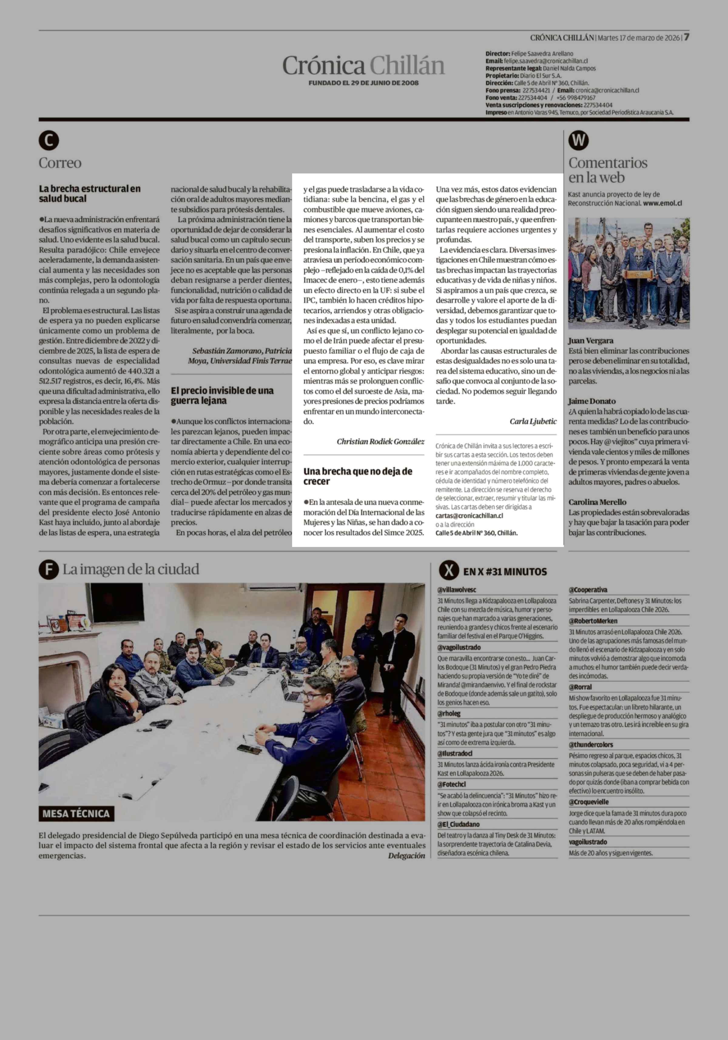Cartas: Una brecha que no deja de crecer 17-03-2026 Crónica de Chillán |