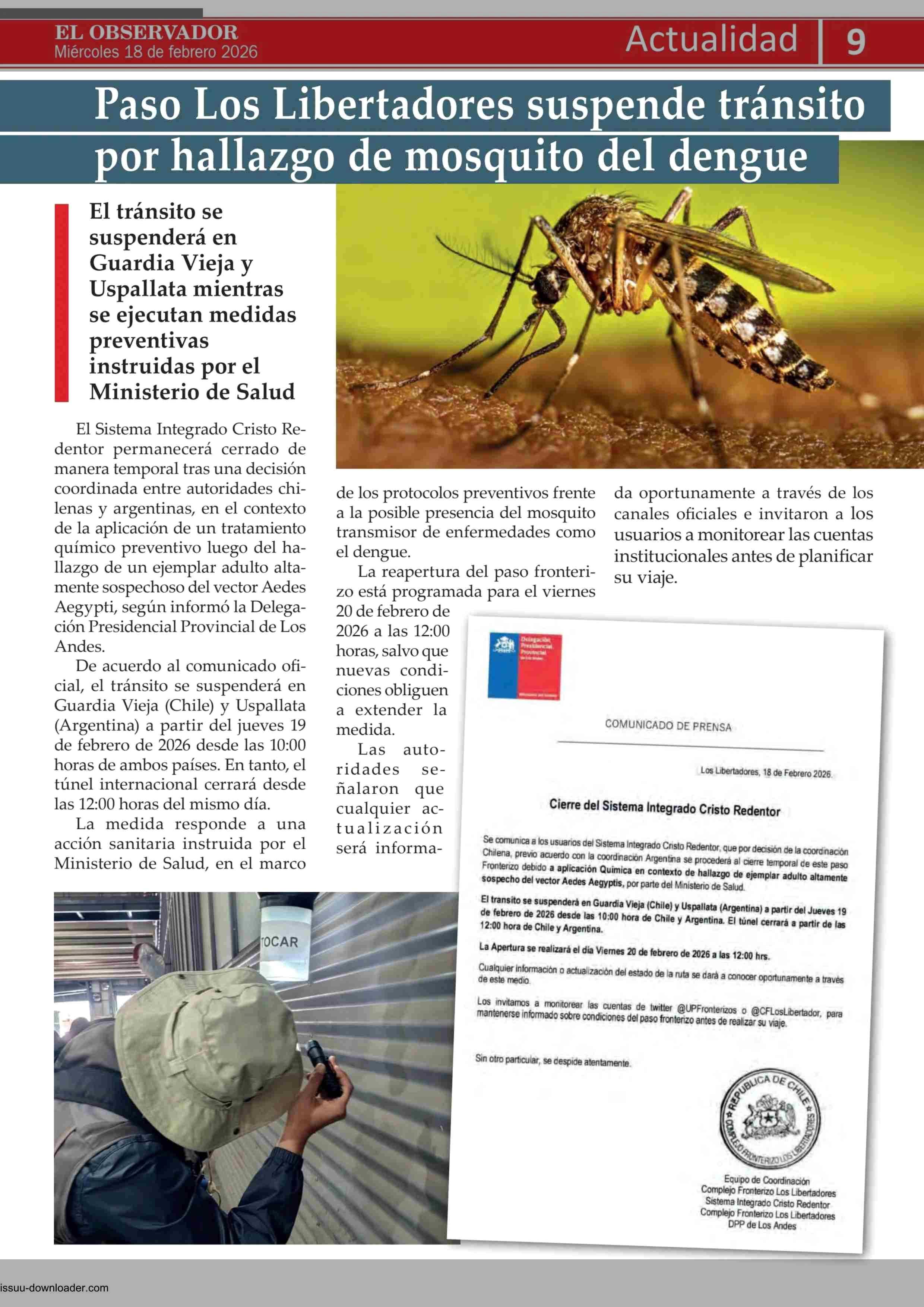Paso Los Libertadores suspende tránsito por hallazgo de mosquito del dengue 18-02-2026 El Observador Vespertino |