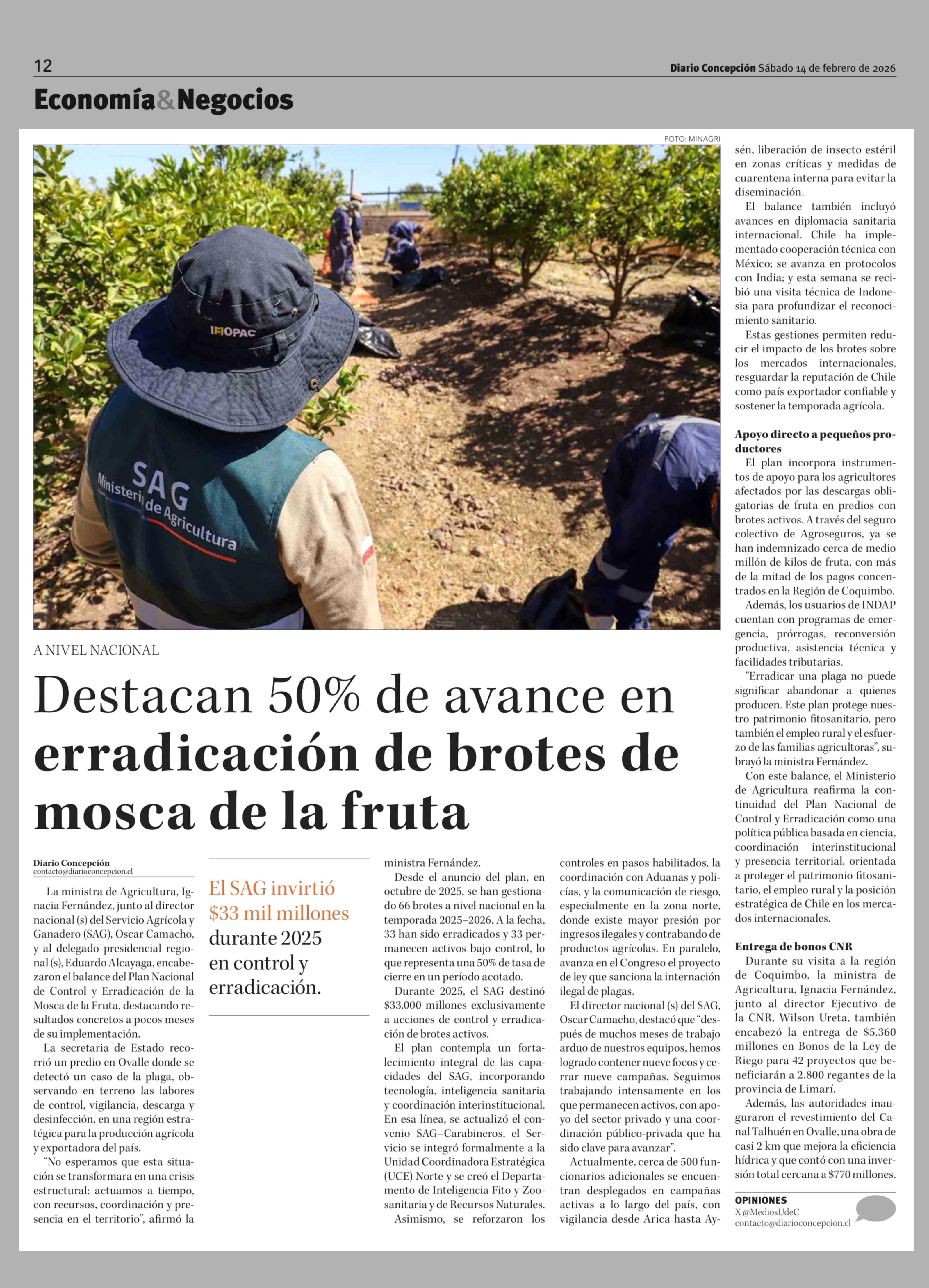 Destacan 50% de avance en erradicación de brotes de mosca de la fruta 14-02-2026 Diario Concepción |