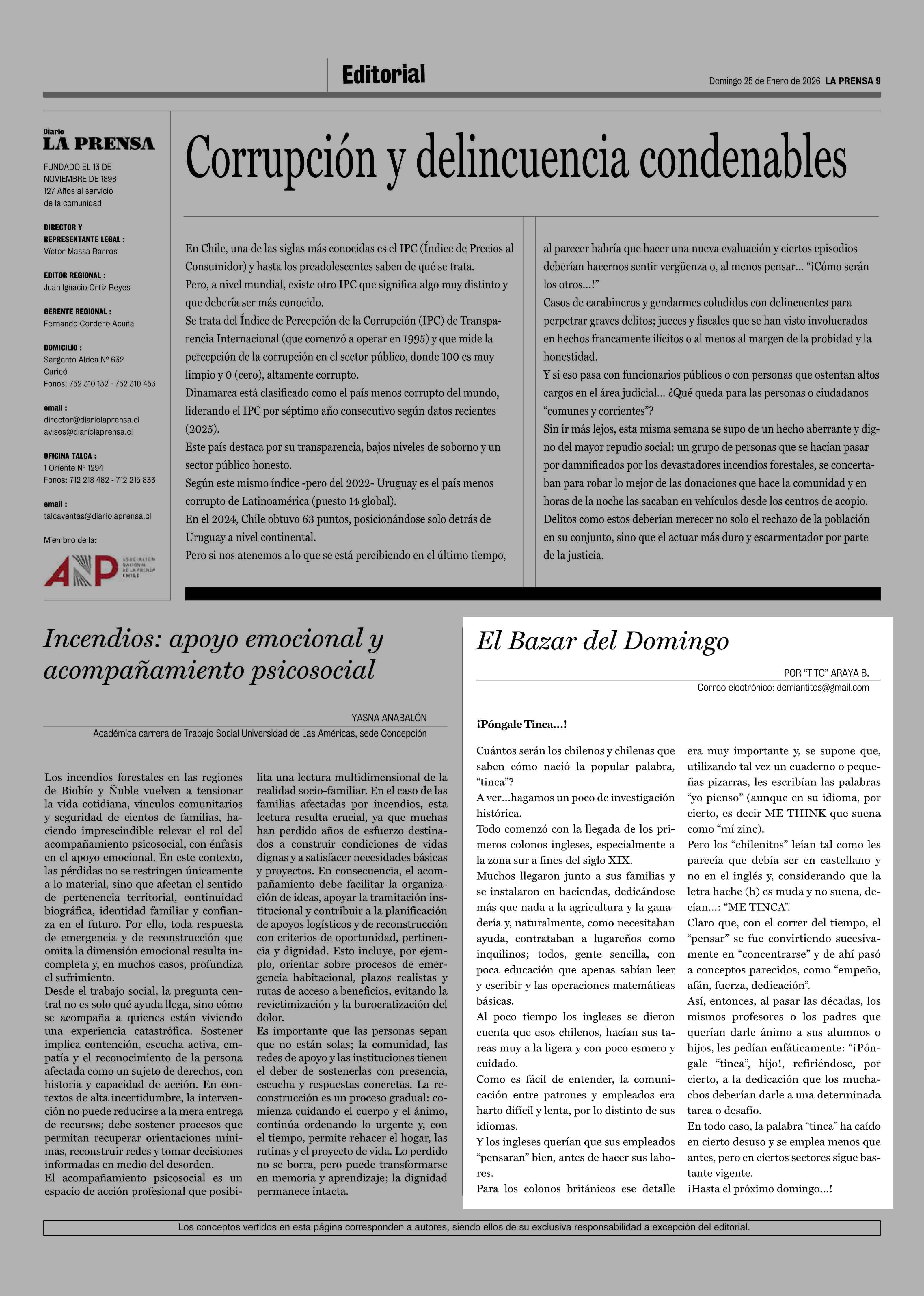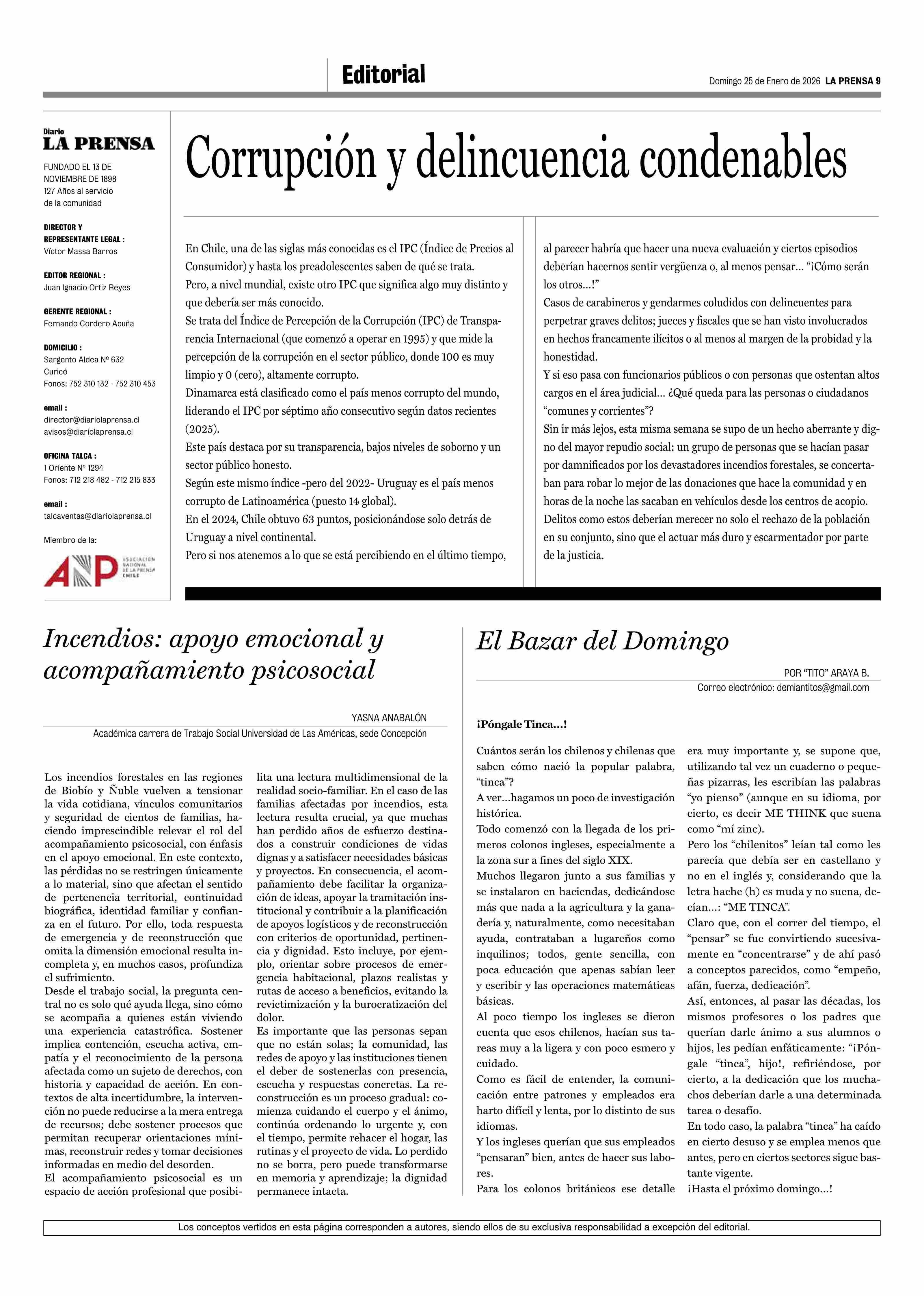 Columnas de Opinión: El Bazar del Domingo 25-01-2026 La Prensa de Curicó |