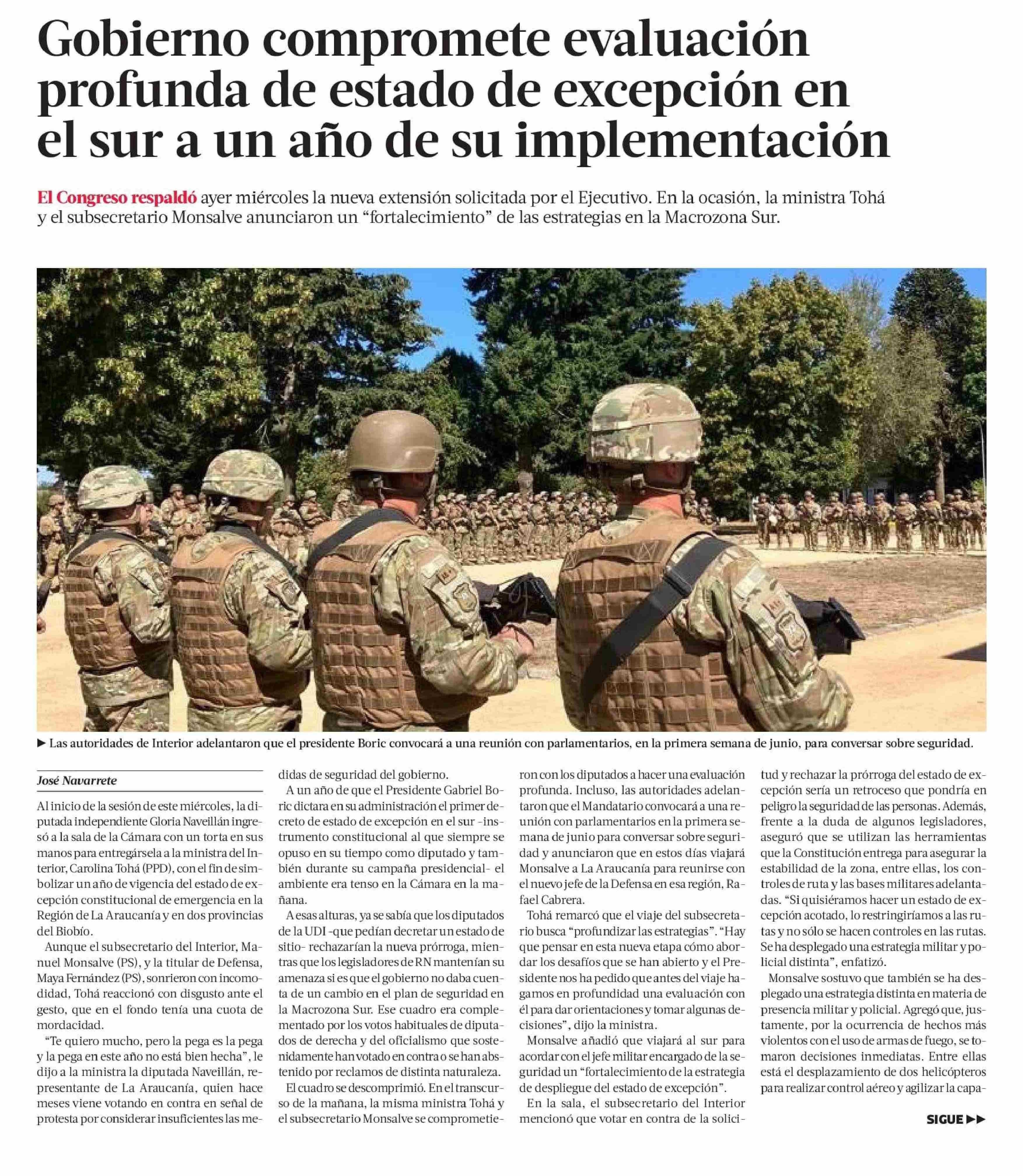 Gobierno compromete evaluación profunda de estado de excepción en el sur a un año de su implementación 18-05-2023 La Tercera |