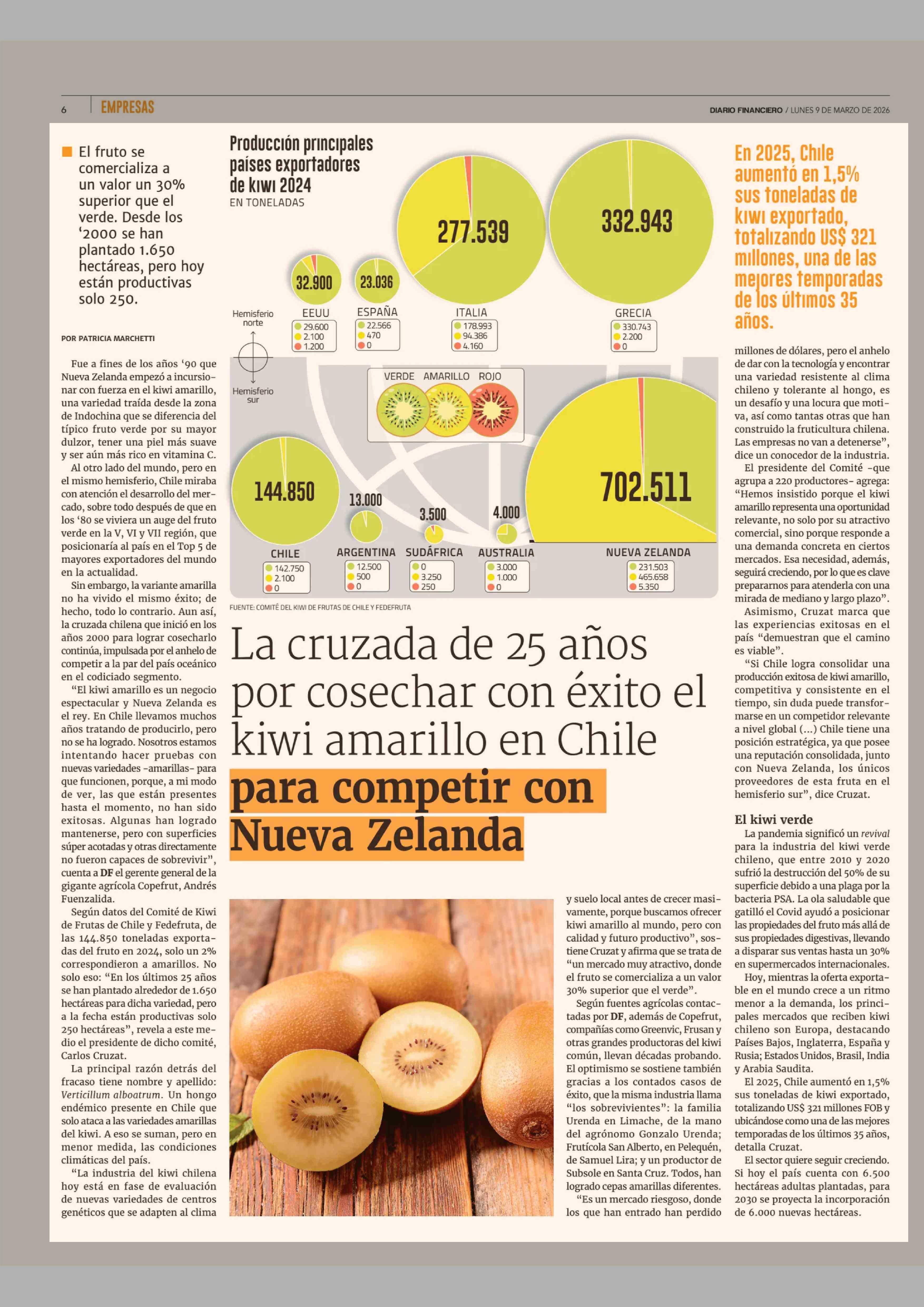 La cruzada de 25 años por cosechar con éxito el kiwi amarillo en Chile para competir con Nueva Zelanda 09-03-2026 Diario Financiero |