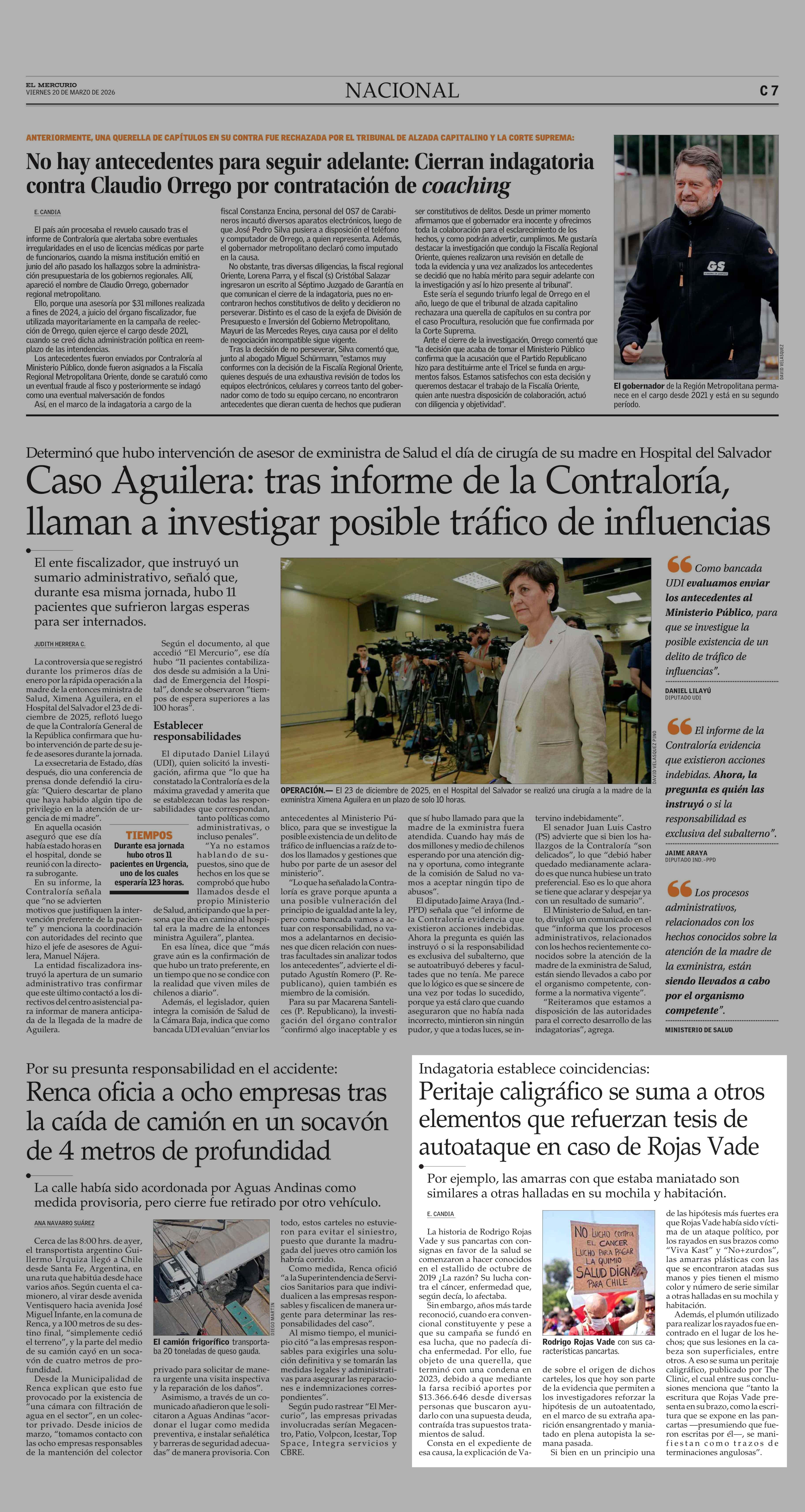 Peritaje caligráfico se suma a otros elementos que refuerzan tesis de autoataque en caso de Rojas Vade 20-03-2026 El Mercurio |