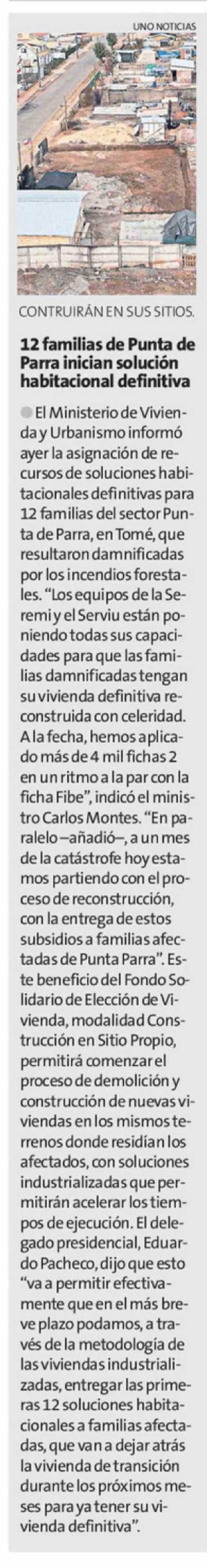 12 Familias de Punta de Parra inician solución habitacional definitiva 17-02-2026 La Estrella de Concepción |
